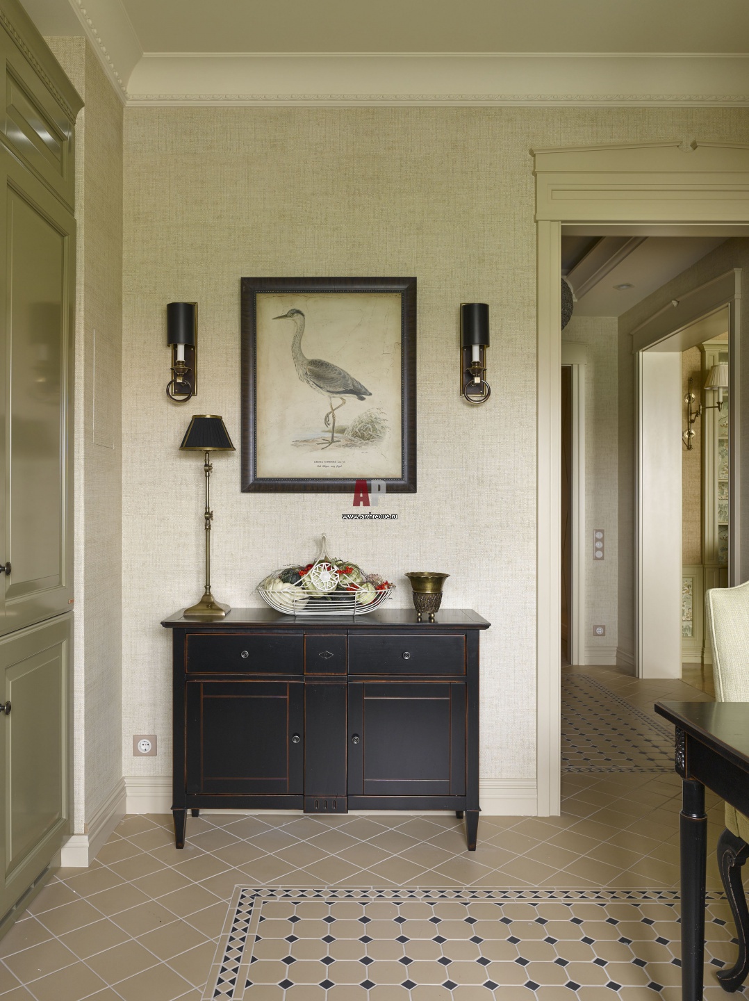 Фото интерьера кухни в стиле неоклассика. Комод, Siguier. Бумажные обои Thibaut имитируют рогожку. Черные бра, Estro. Настольная лампа на бронзовом основании, Eichholtz.