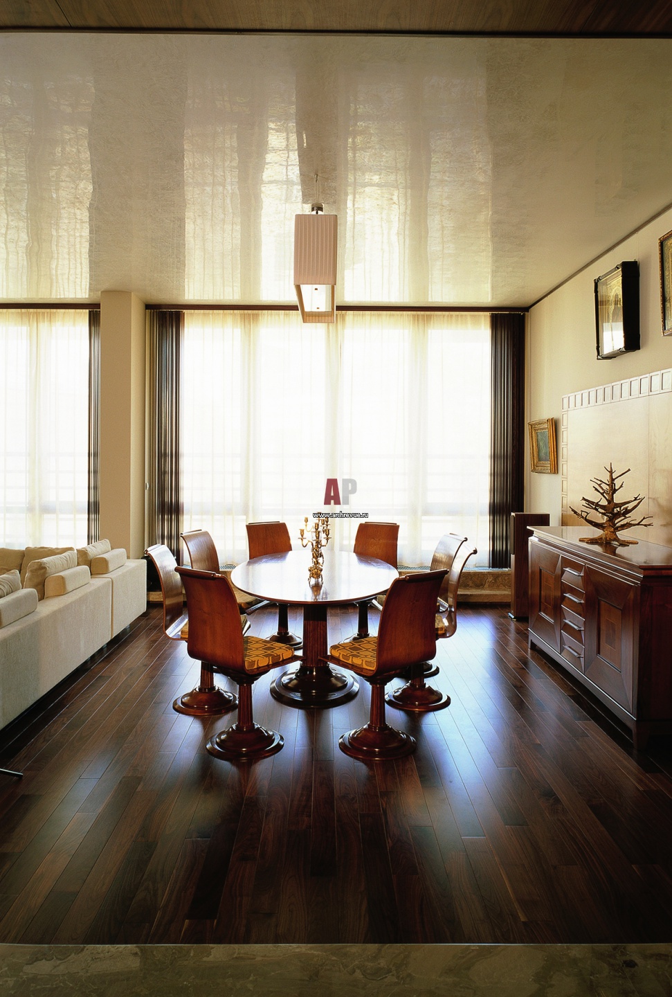 Зона столовой объединена с пространством гостиной. Потолки декорированы декоративными штукатурками с имитацией камня, поставщик «Крит».