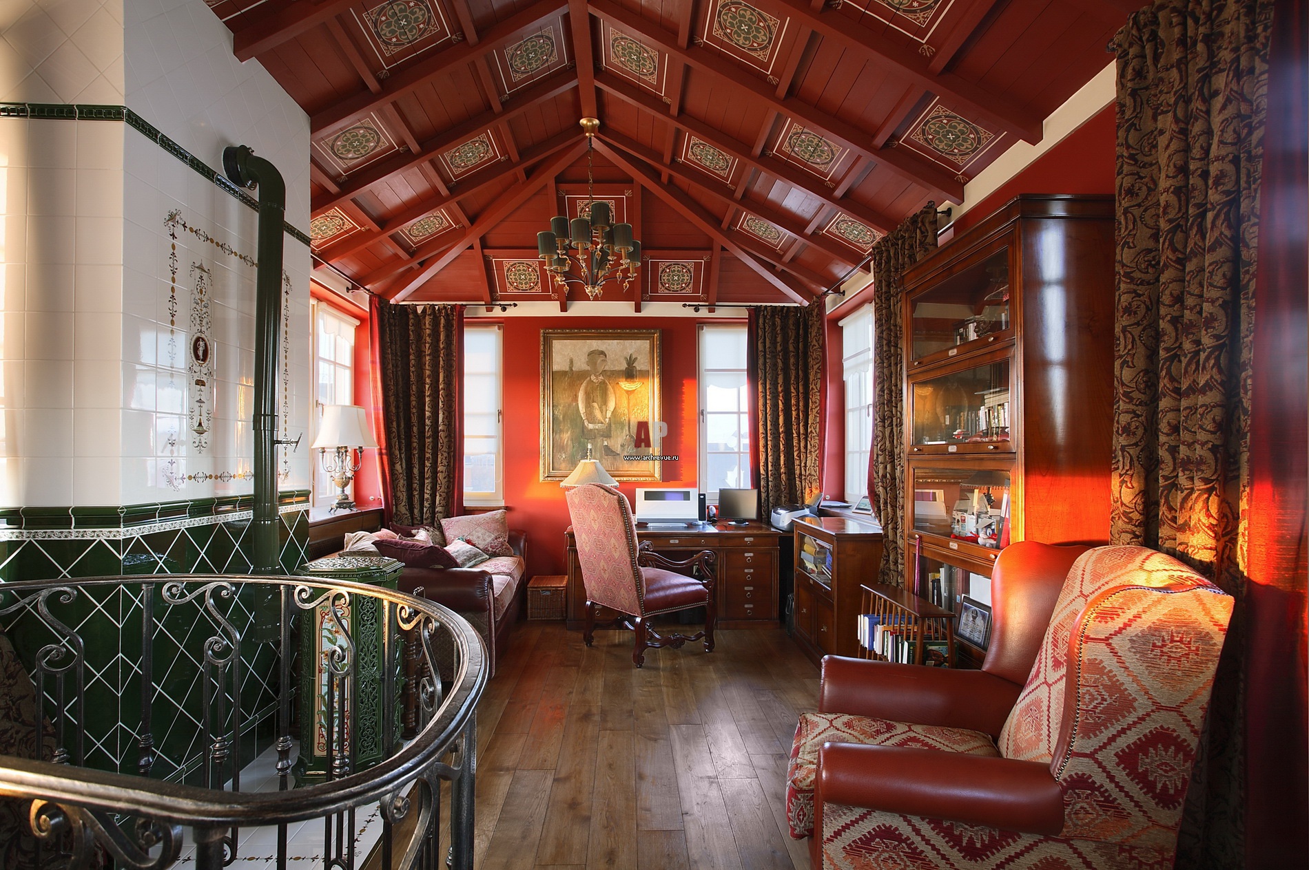 Под коньком крыши размещен кабинет. Он решен в традиционном английском стиле. Дощатый потолок выкрашен в густой винный цвет и украшен росписью по мотивам старинной английской керамики. С ним контрастирует глазурованная зеленая плитка облицовки печки-буржуйки.