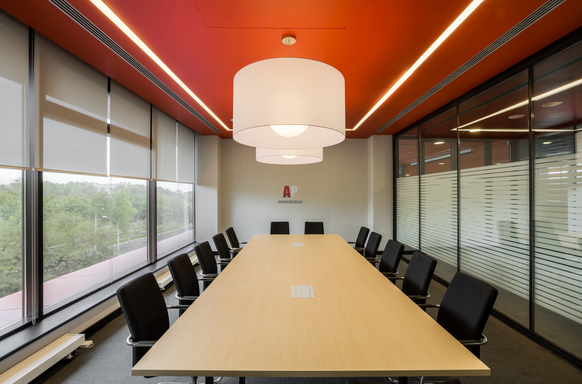 Интерьер красной переговорной на рабочем этаже офиса.