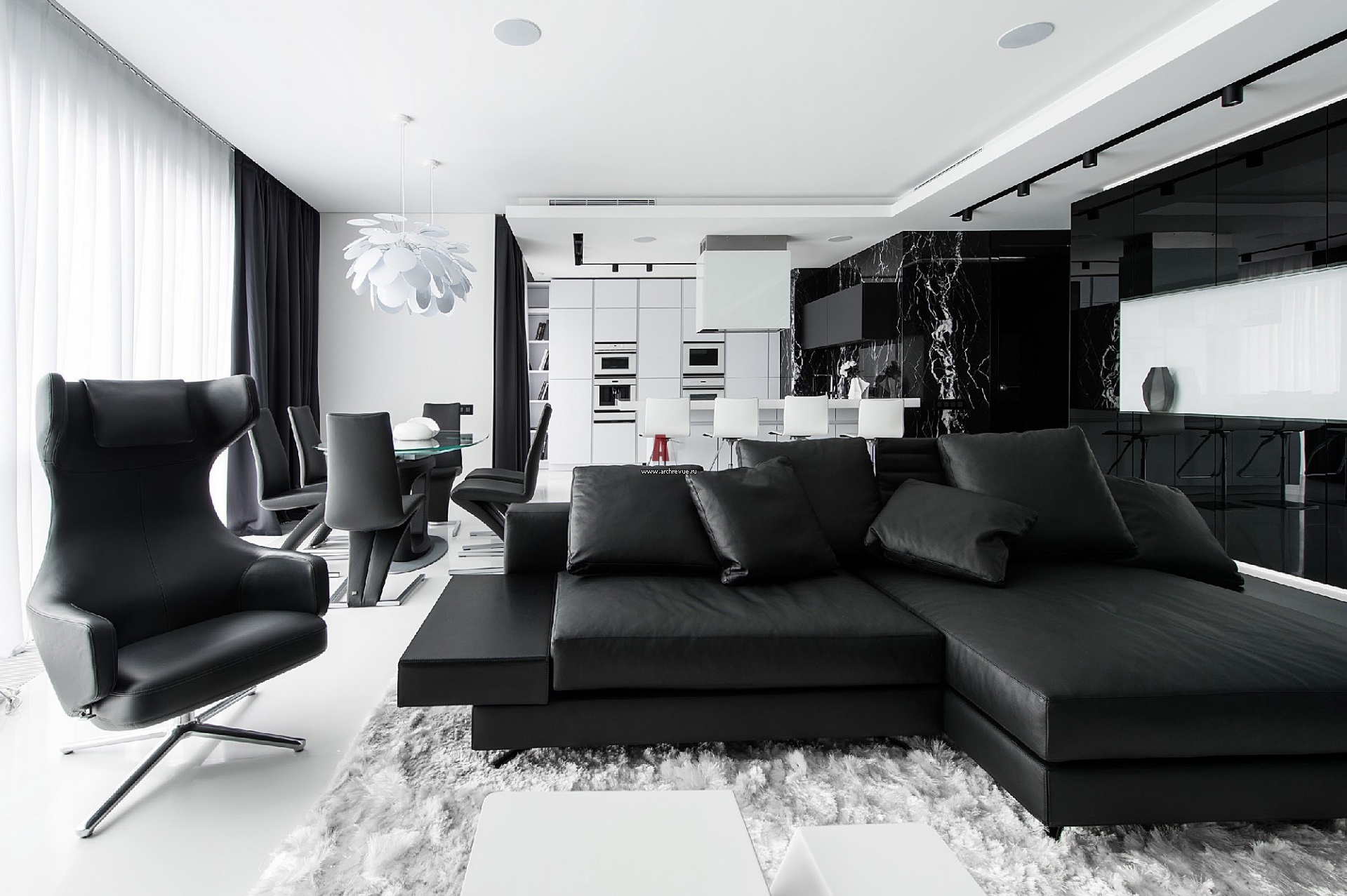Интерьер решен как законченная композиция, функциональные зоны объединены с помощью одинаковых декоративных приемов и материалов. За фасадами из черного стекла скрыта система хранения.
