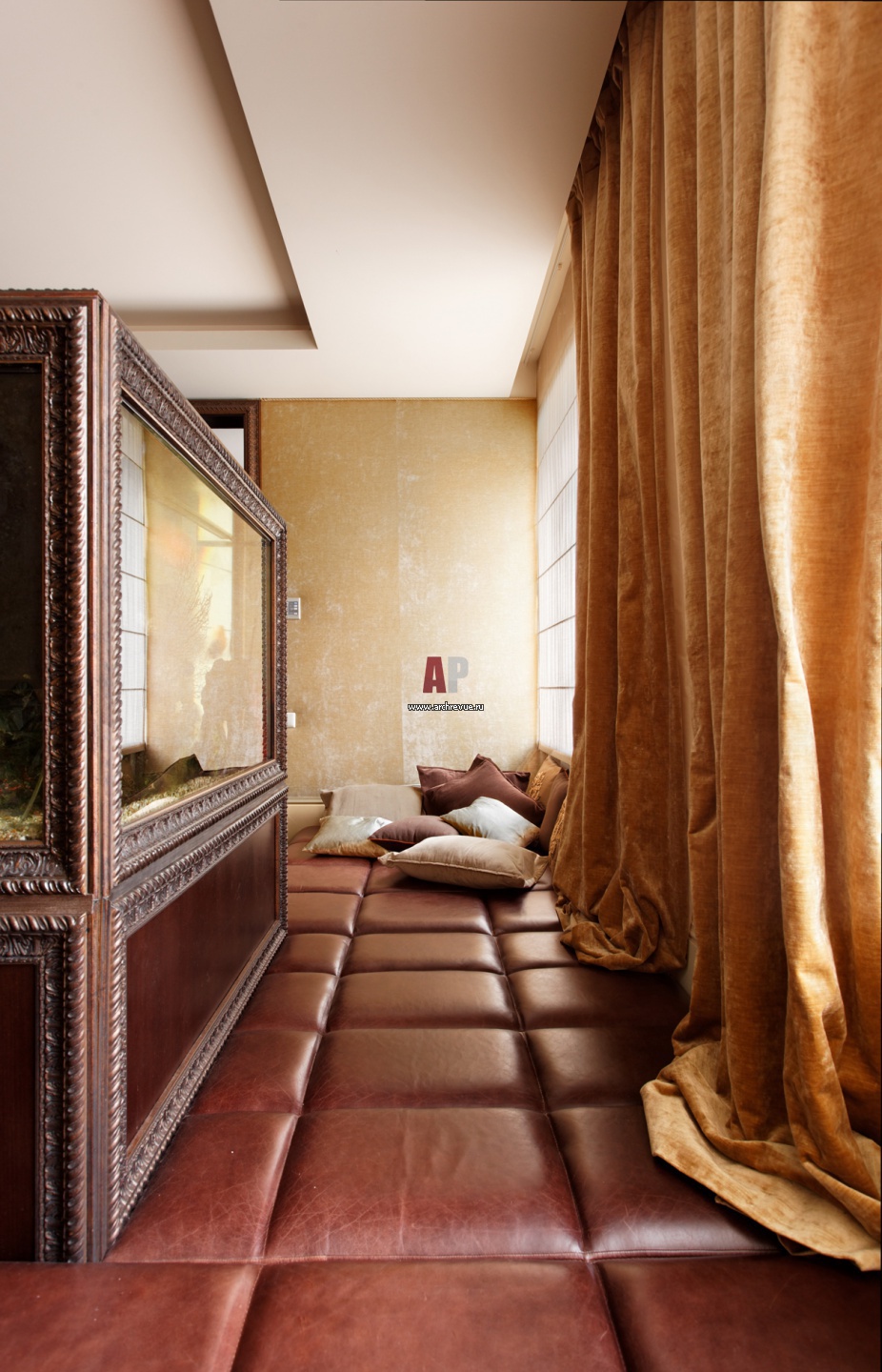 В столовой, между аквариумом и окном находится зона отдыха. Она обустроена на мягком кожаном подиуме.