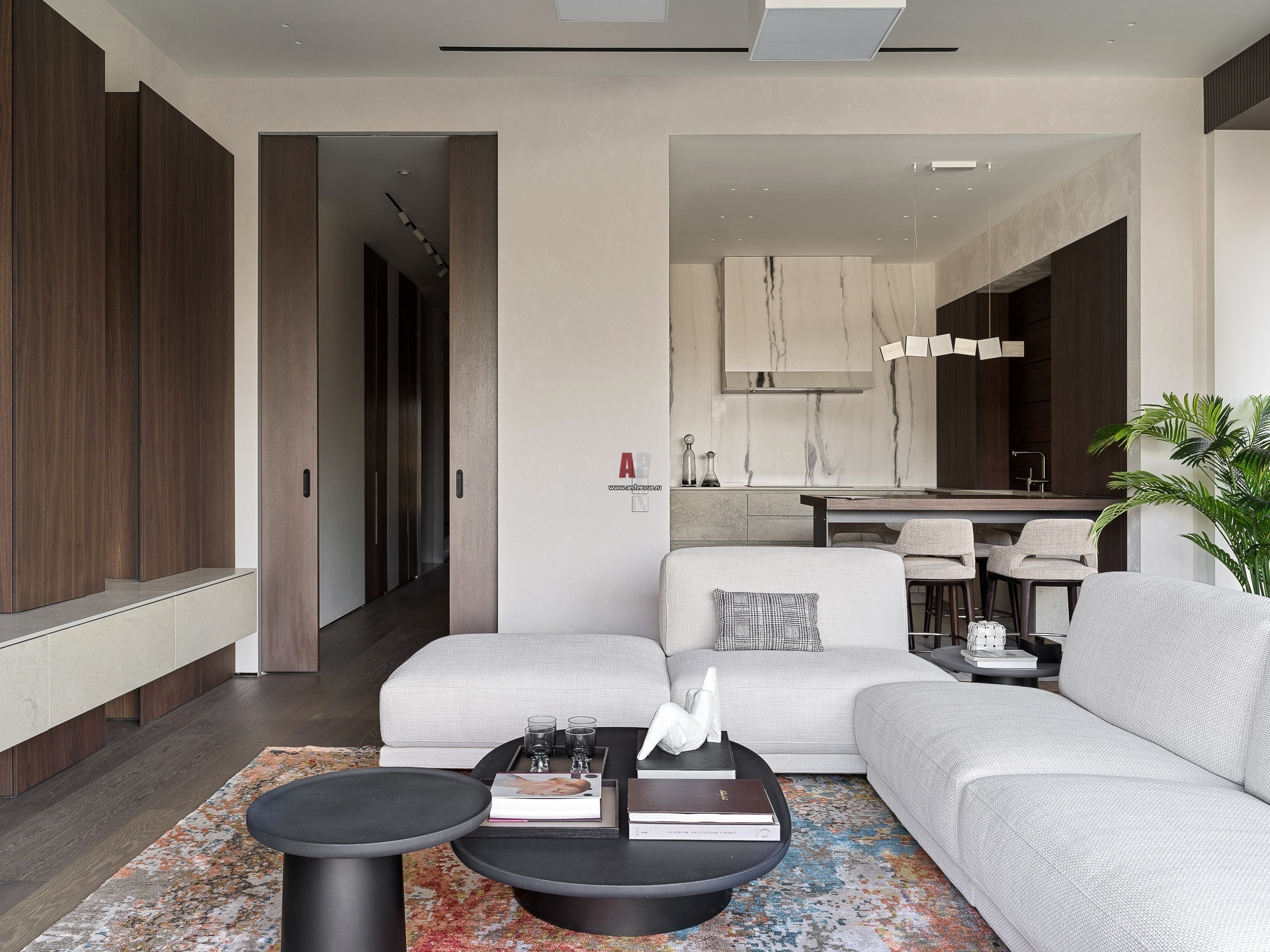 Современная квартира с контрастным интерьером. Общая гостиная-кухня.