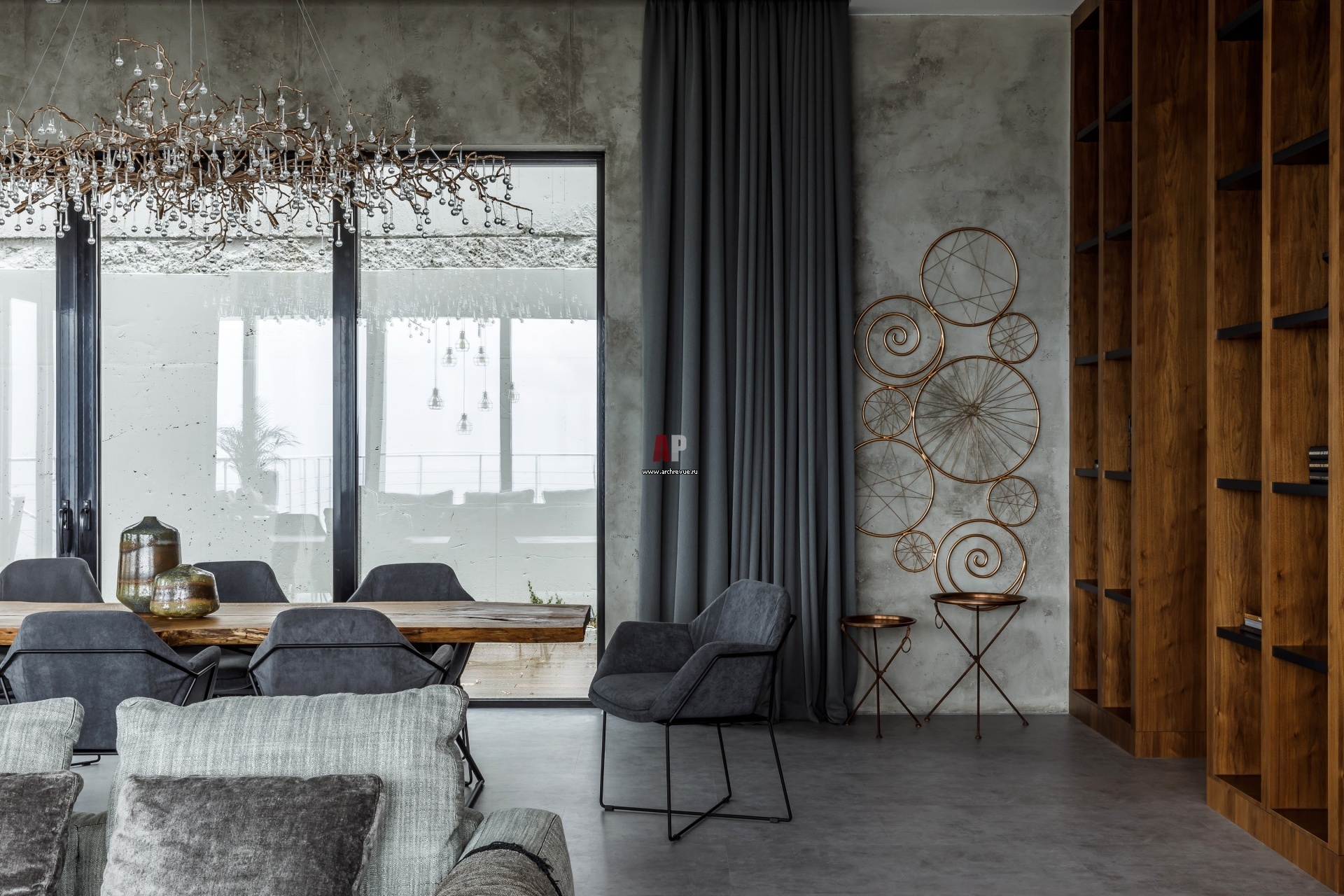 В оформлении гостиной использован шпон ореха и микроцемент. Вместе они создают в меру брутальный интерьер с северным колоритом. Стена за обеденным столом из матового стекла, за ней – поддерживающая склон плита.