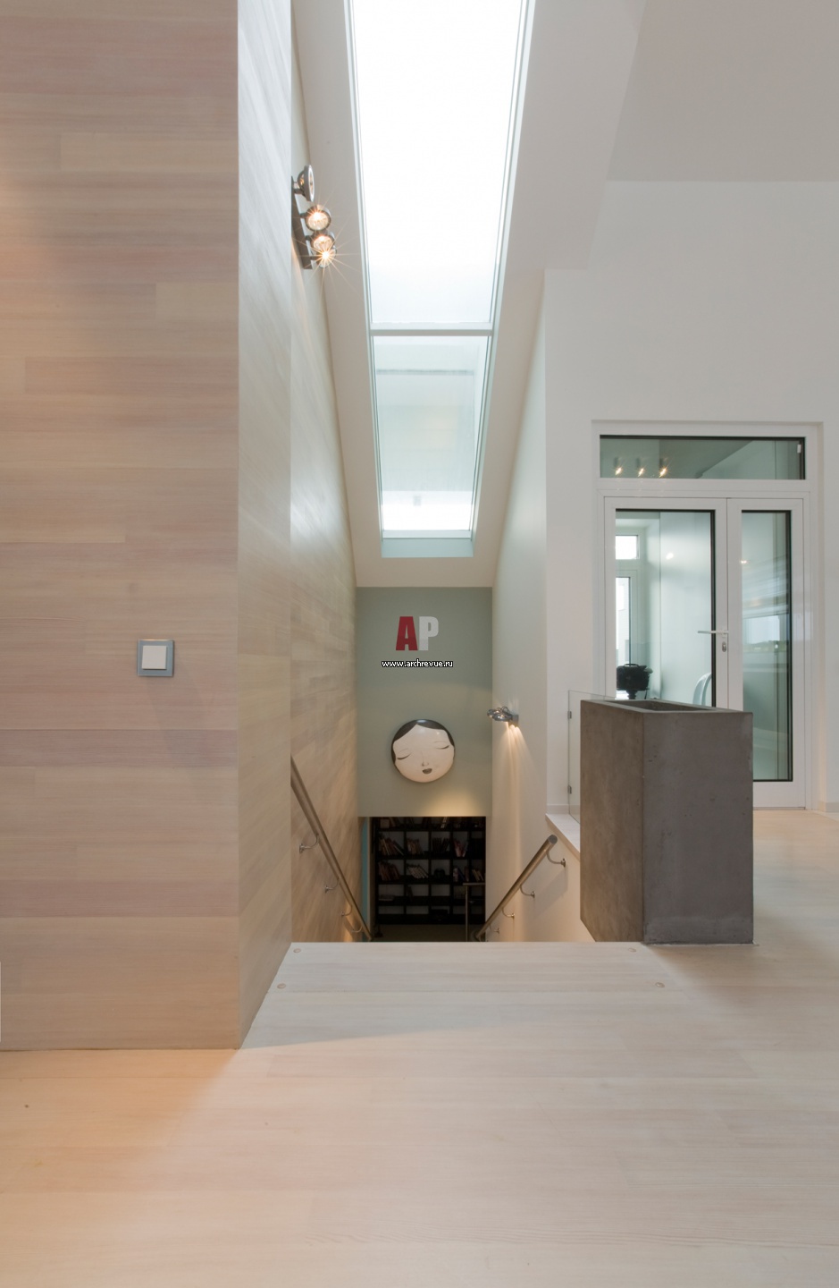 Лестница ведет на нижний этаж, где разместились приватные помещения. Авторы проекта Петр Зайцев, Арсений Борисенко, архитектурное бюро za bor. Стены и пол обшиты массивной доской из лиственницы.
