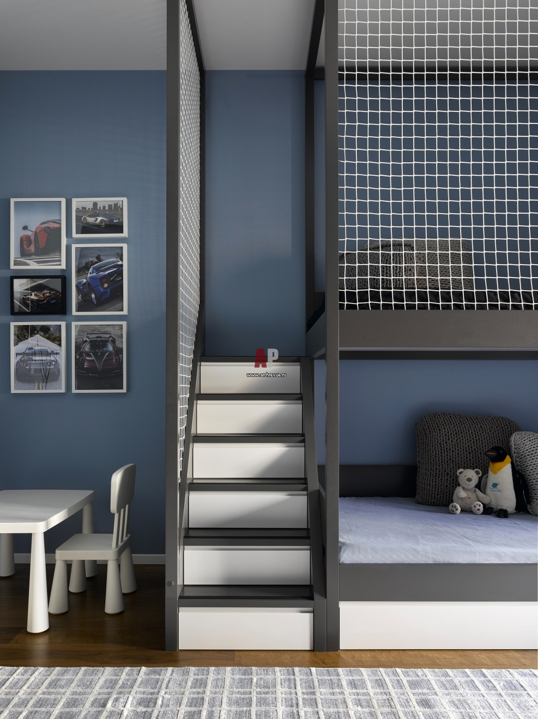 Двухуровневая кровать в детской сделана на заказ. Стены комнаты выкрашены в нейтральный синий цвет.