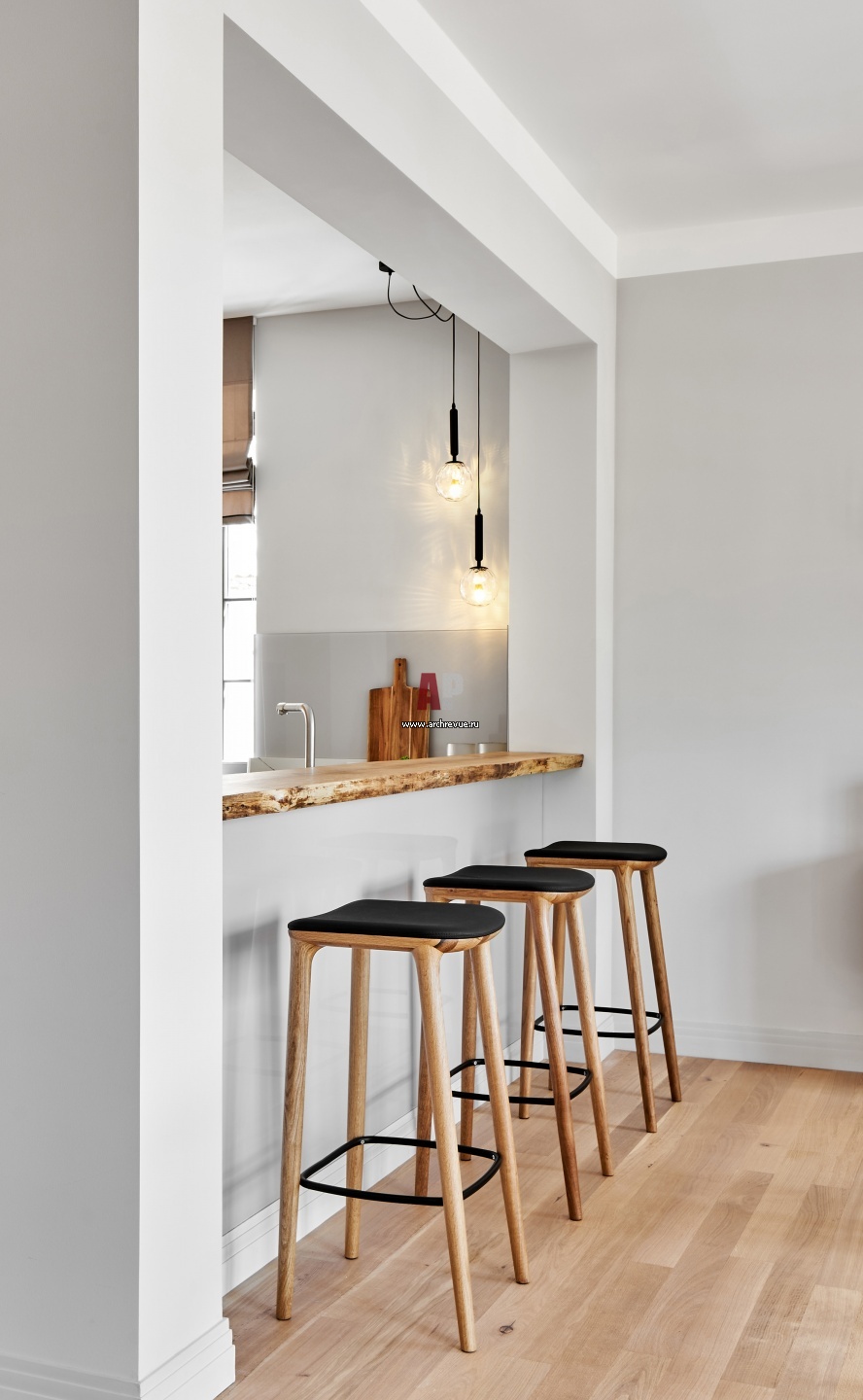 Важный элемент кухни – барная стойка, ее столешница выполнена из толстого спила дуба.