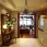 Столовая в стиле кантри. На стенах – терракотовые обои с мелким рисунком. Буфет, библиотека, столовый гарнитур - из выкрашенного в белый цвет дерева. Светильник с белым тканевым абажуром с элементами из бронзы.