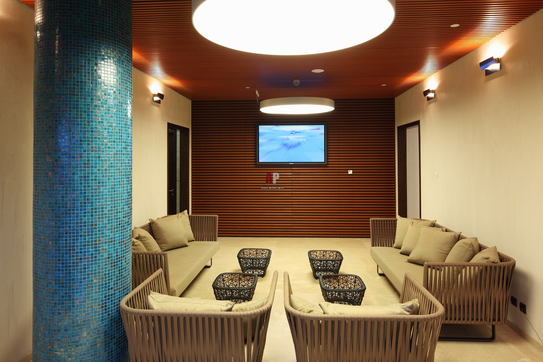 Зона отдыха при SPA-комплексе. Торцевая стена и потолок декорированы деревянными панелями. Колонна облицована мозаикой лазурно-голубого цвета. Мебель для релакса отделана кожей.