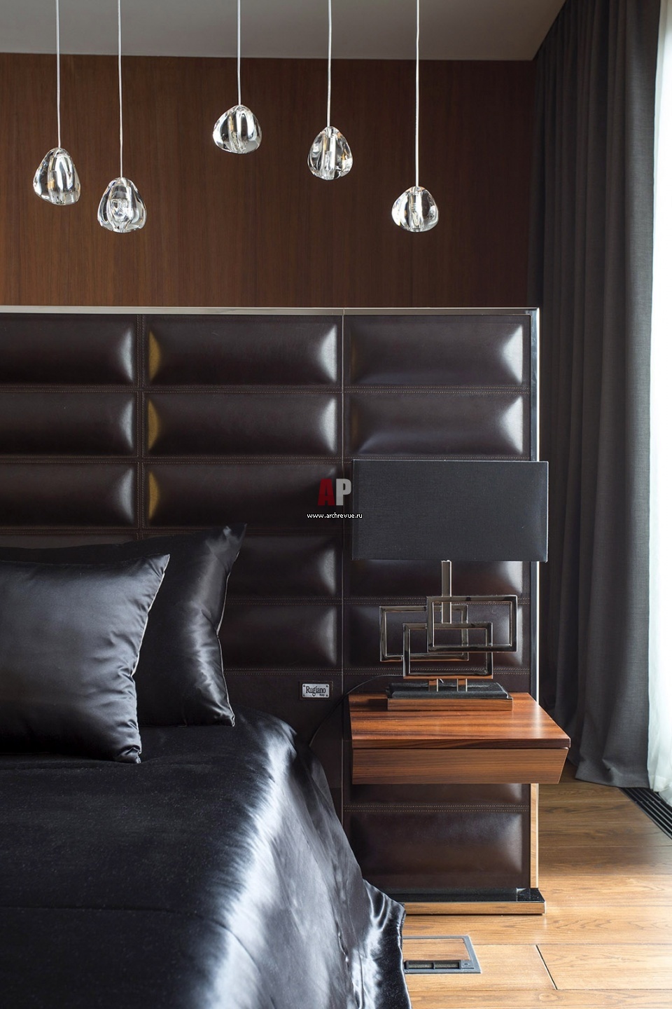 Интерьер спальни в темных шоколадных тонах. Светильники Terzani над изголовьем кровати отделяют зону спальни от рабочего блока. Настольная лампа, Flos. Светильники прикроватные, Eichholtz.