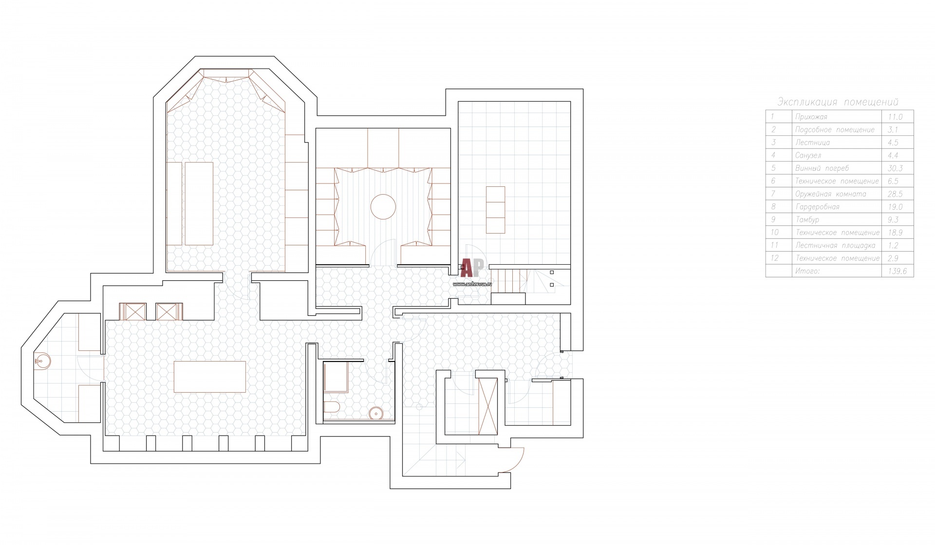 Планировка цокольного этажа 3-х этажного семейного дома в эклектичном стиле.