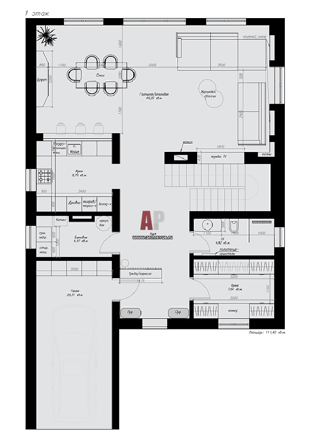 План первого этажа небольшого двухэтажного дома для семьи с детьми. Общая площадь – 230 кв. м.