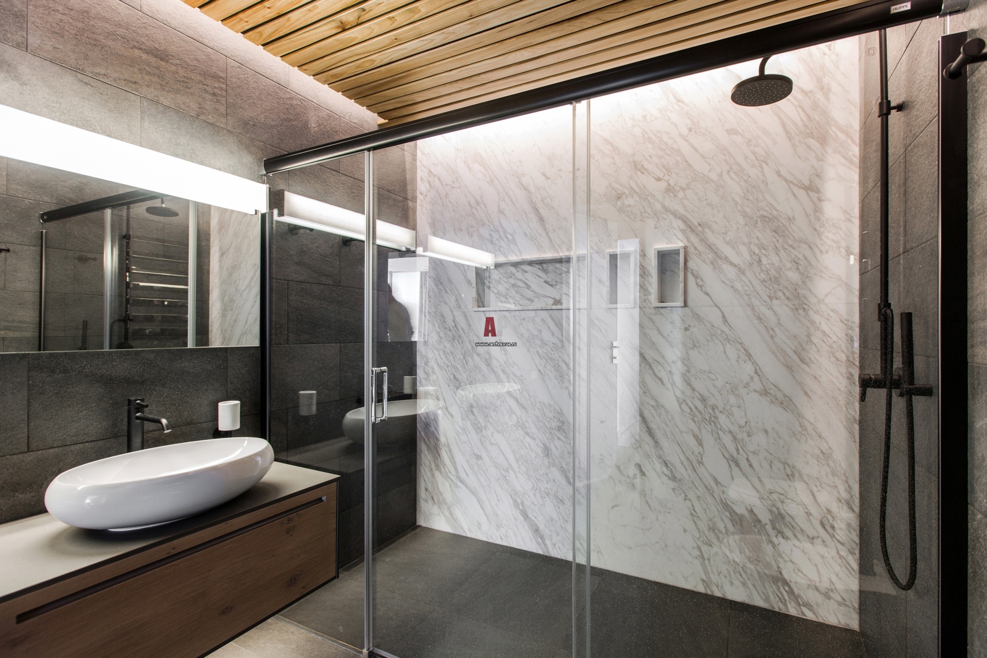 За стеклянными дверями ниши с ванной находится санузел с душевой кабиной и двумя раковинами, встроенными в каменную столешницу. Стены и пол отделаны мрамором Volakas Extra. Потолок зашит рейками из карагача.