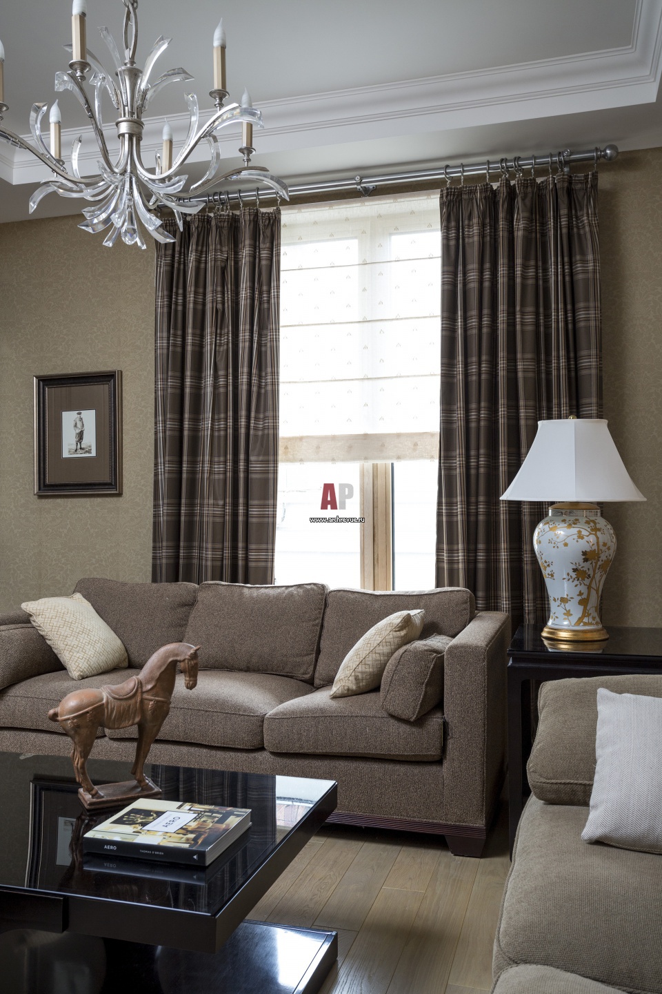 Интерьер гостиной в стиле современная классик. Широкие лепные потолочные карнизы Orac Decor, поставщик «Ампир Декор». Шторы шоколадного цвета с рисунком «шотландская клетка».