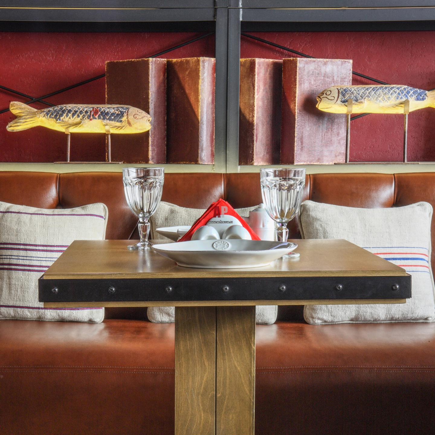 Диванная группа в кафе в красно-коричневой цветовой гамме. В нишах выставлены керамические рыбы.