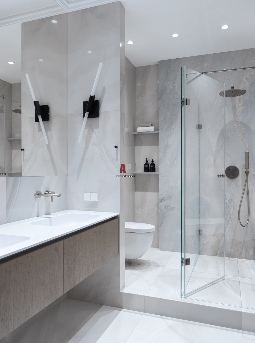 Зона душевой в хозяйской ванной комнате. Керамогранит, Rex. Панно в душе из мрамора Pallisandro Bluette.