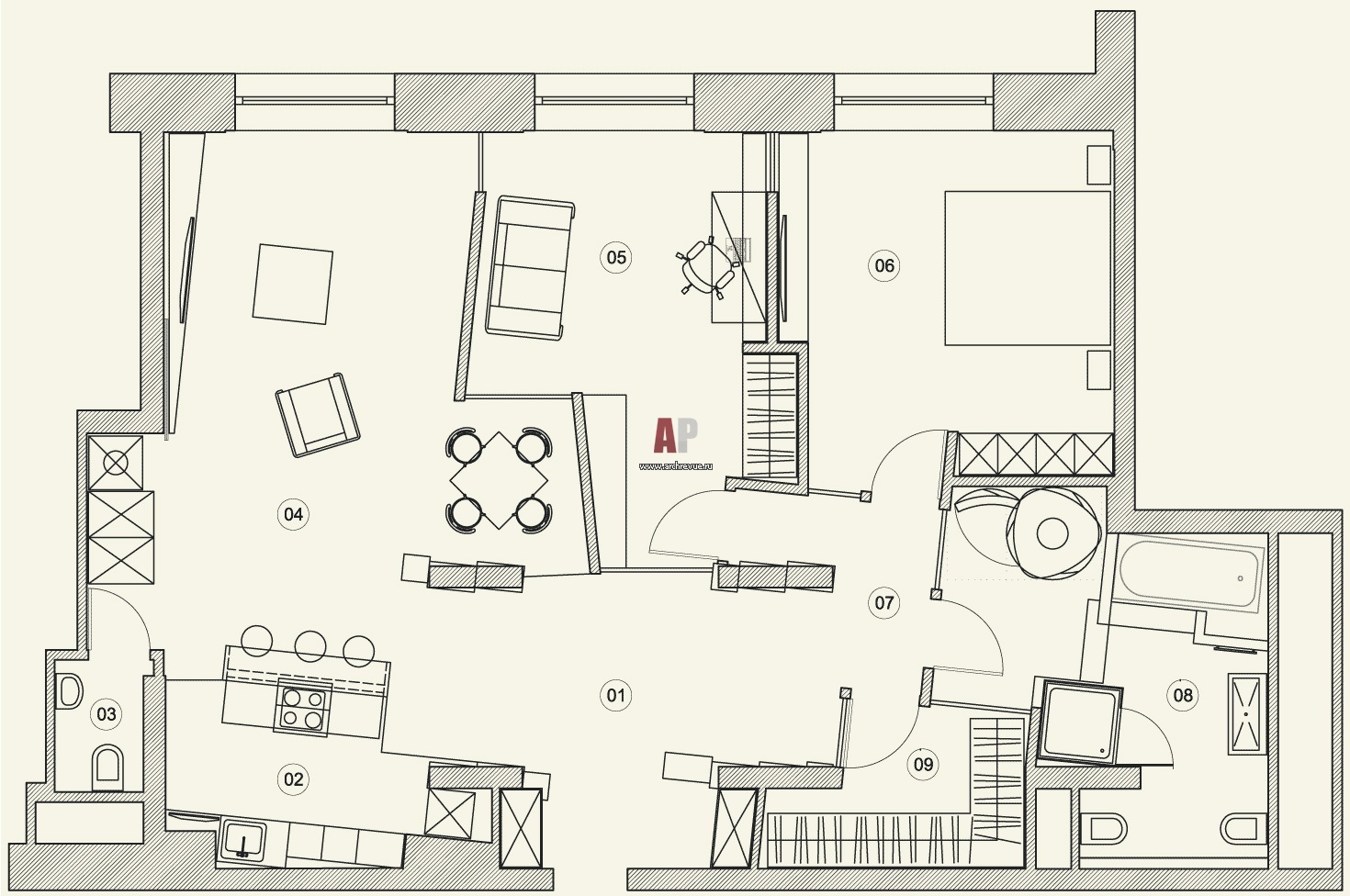 Интерьер современной трехкомнатной квартиры со студийной кухней-гостиной.