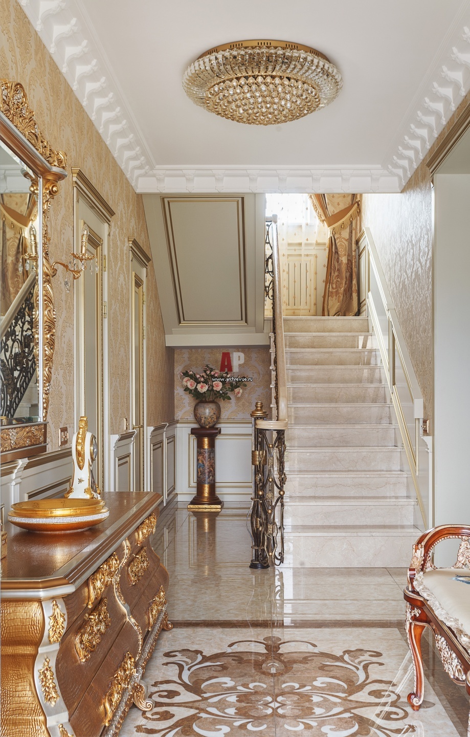Интерьер лестничного холла в стиле облегченной золотой классики. Стены оформлены текстильными обоями с дамасками.