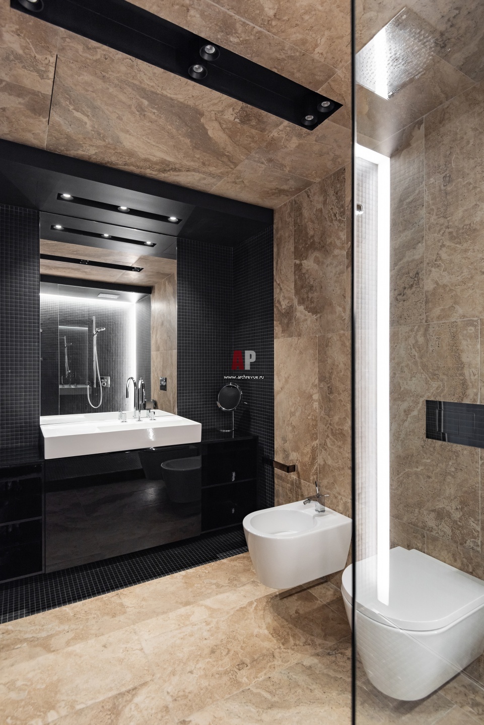 Санузел. Стены оформлены травертином. Сантехника, Laufen.