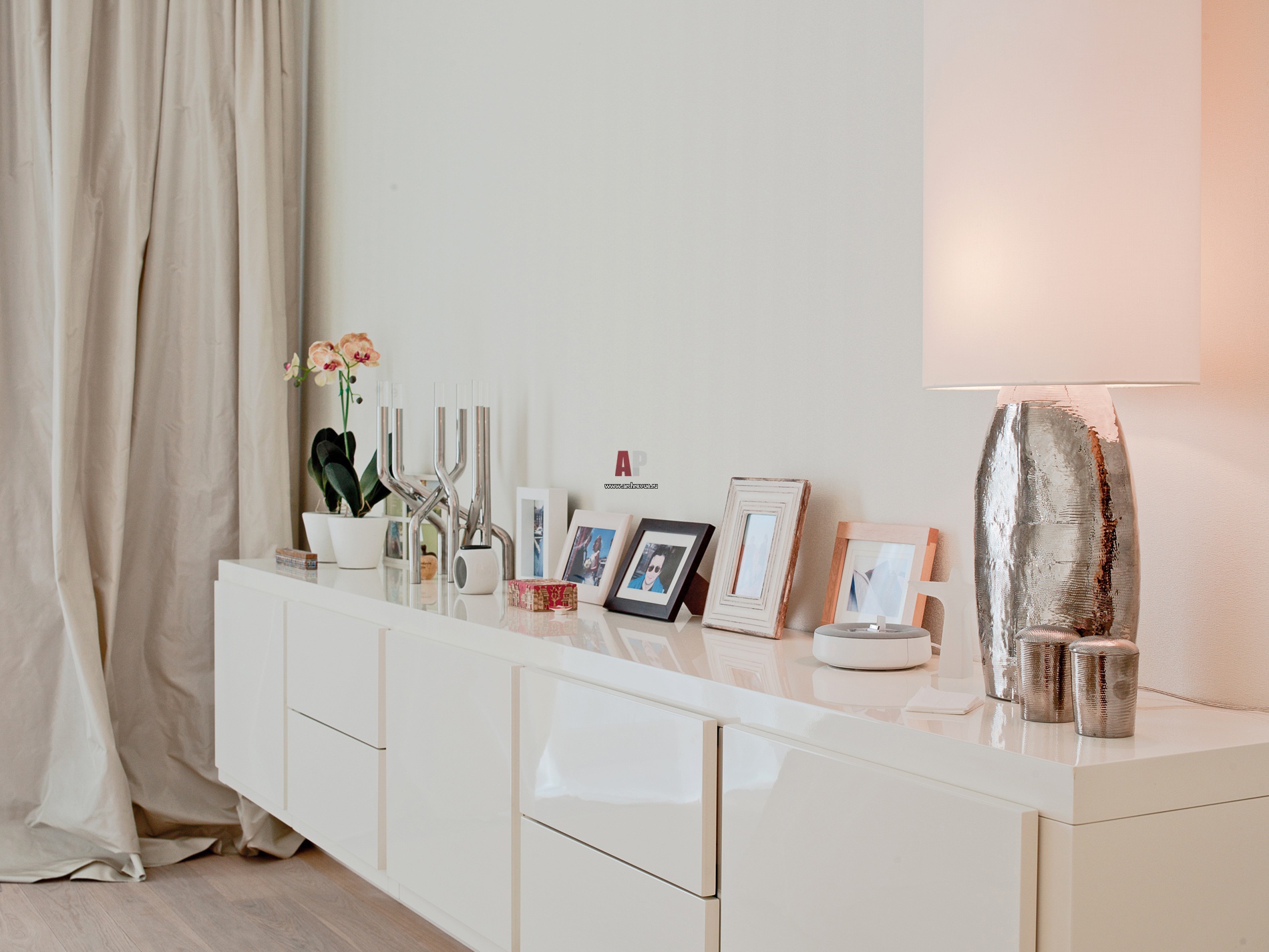Система хранения в спальне исполнена в белом лаке. полки открываются на нажатие.
