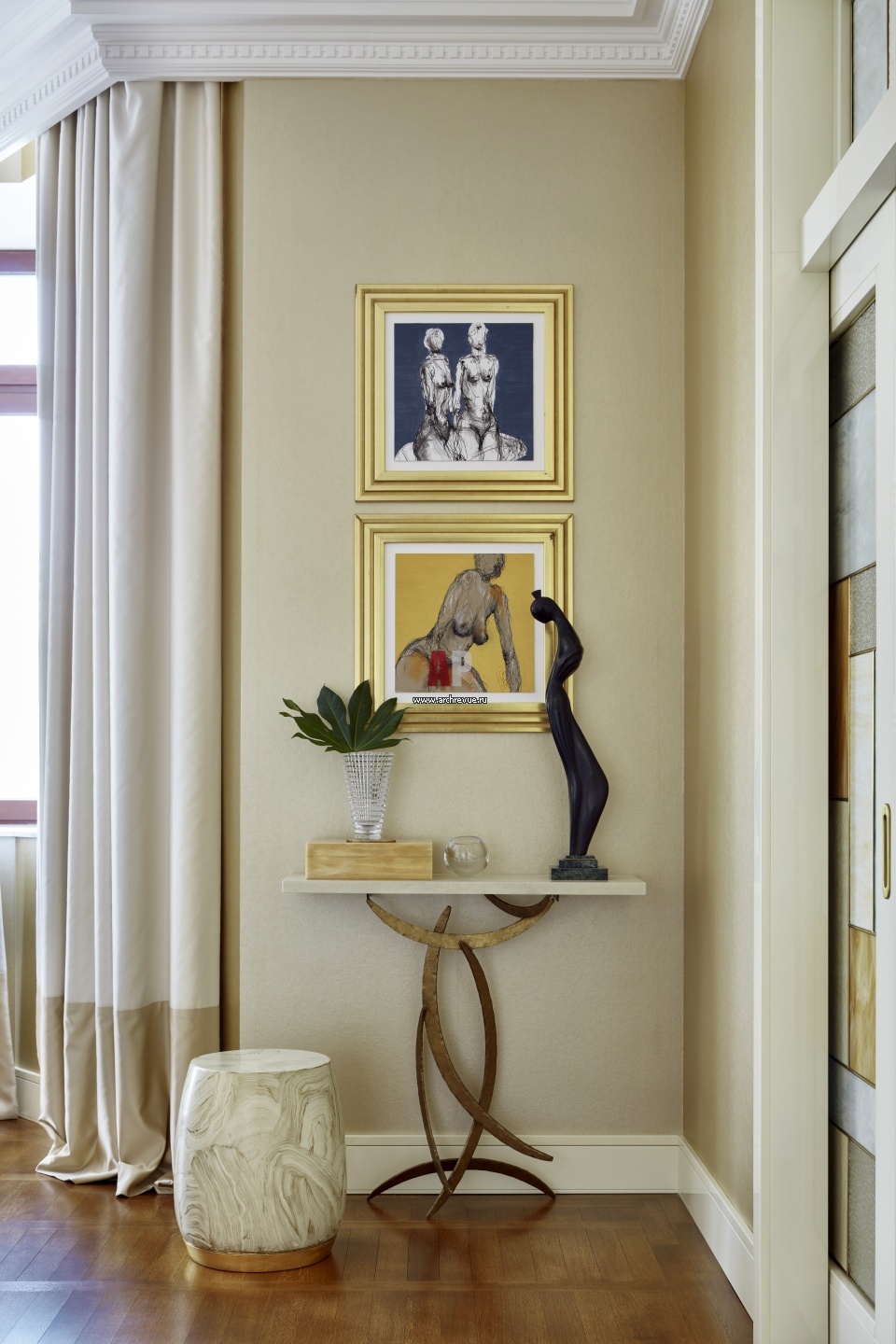 Фрагмент гостиной с теплыми золотистыми стенами. Консоль, Porta Romana. Столик, Baker. Картины, художник Франсуа Саук.