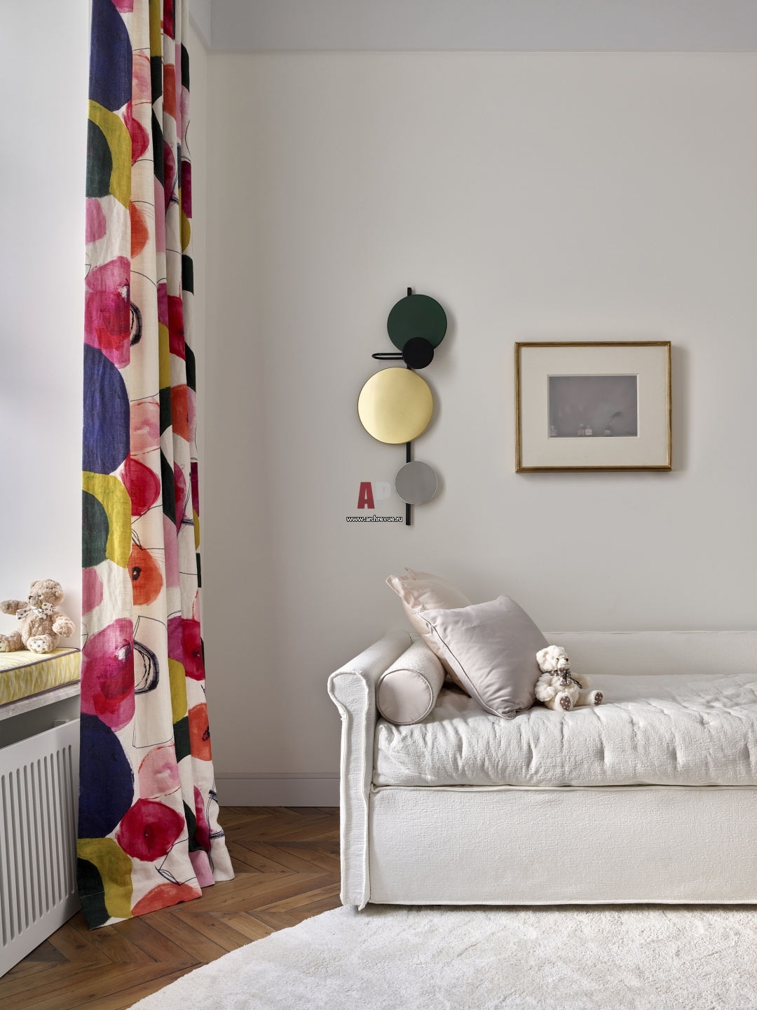 Эклектичная квартира в историческом доме в центре Москвы. Детская комната. На стене картина работы Юрия Купера и авангардное бра, Please Wait to be Seated.