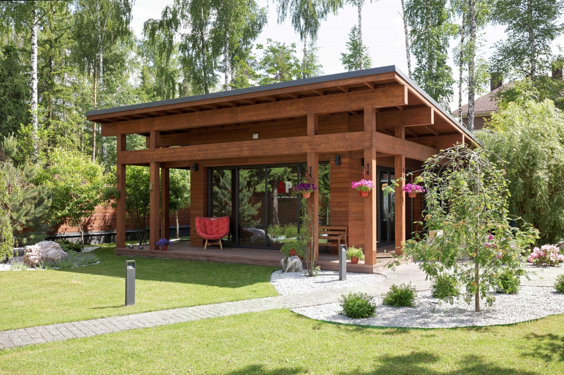 Помимо основного дома на участке находится павильон для барбекю, построенный в стилистике главного дома. Его панорамные окна обращены на внутренний двор. Ландшафтное освещение, SLV.