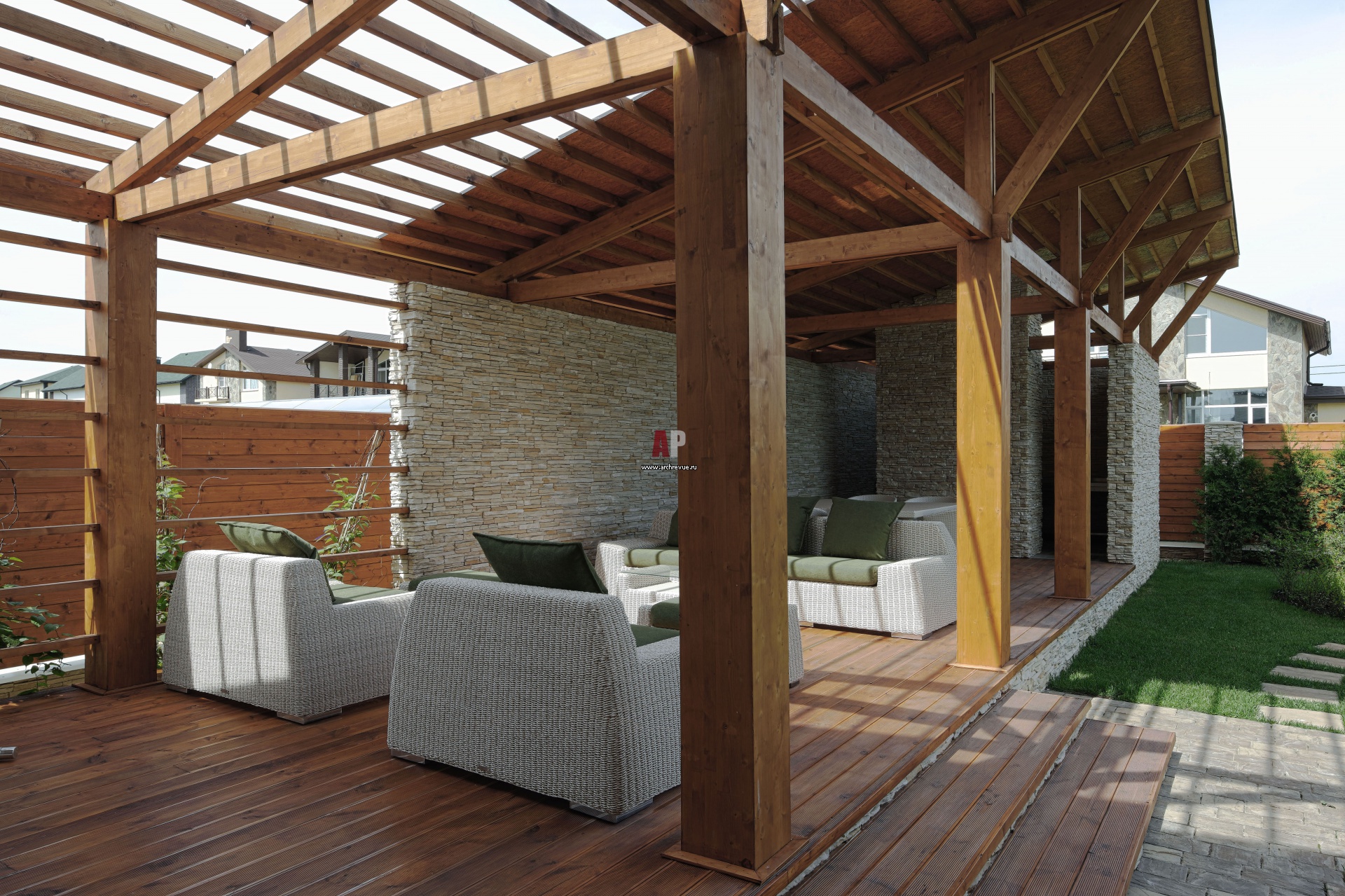 Просторная деревянная беседка-пергола примыкает к дому. Со временем она будет оплетена вьющимся виноградом и полностью закроет вид на соседние участки.