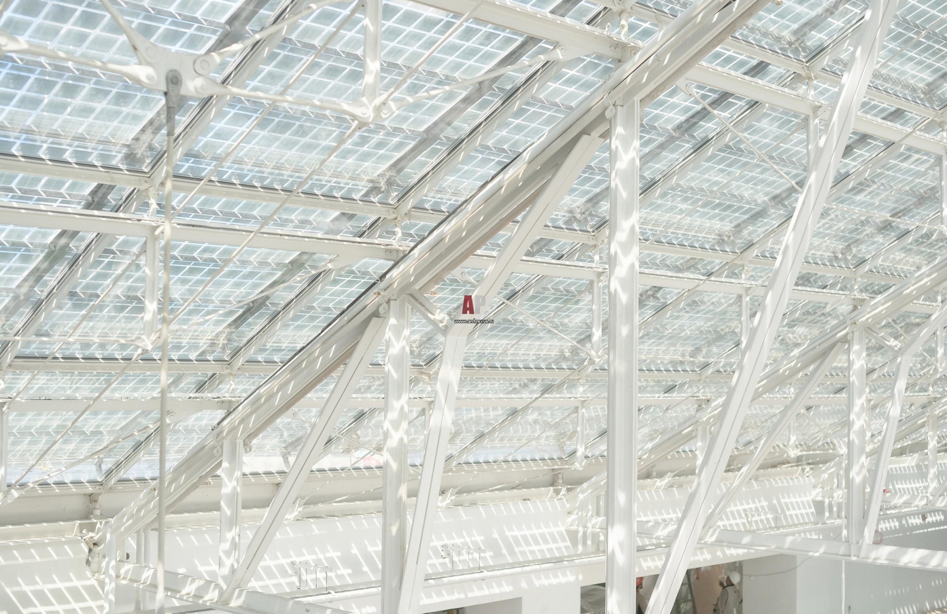 Фрагмент кровли. Ажурная металлическая конструкция тщательно восстановлена. Стекло заменено на современный триплекс.