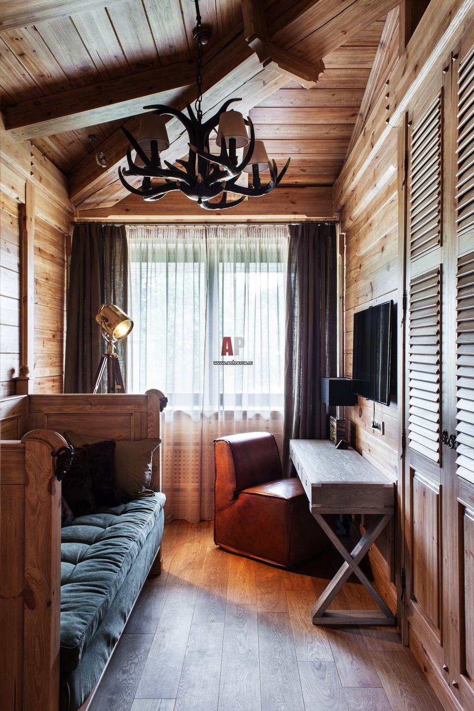 В отделке дома использована сосна и лиственница. Единство конструктивных и декоративных элементов придает целостность интерьерному решению, выявляет «природный» характер интерьера.