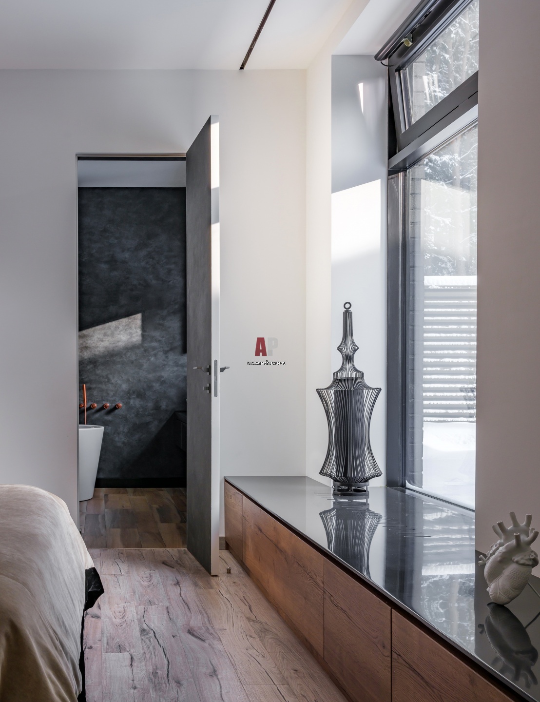 Спальня. Дверь в санузел под покраску, чтобы не выделяться на фоне стены. Со стороны санузла дверное полотно окрашено в цвет санузла, использована декоративная штукатурка, имитирующая черный бетон. Низкий комод вдоль окна с фасадами из ЛДСП. Столешница выполнена из черного акрилового камня.