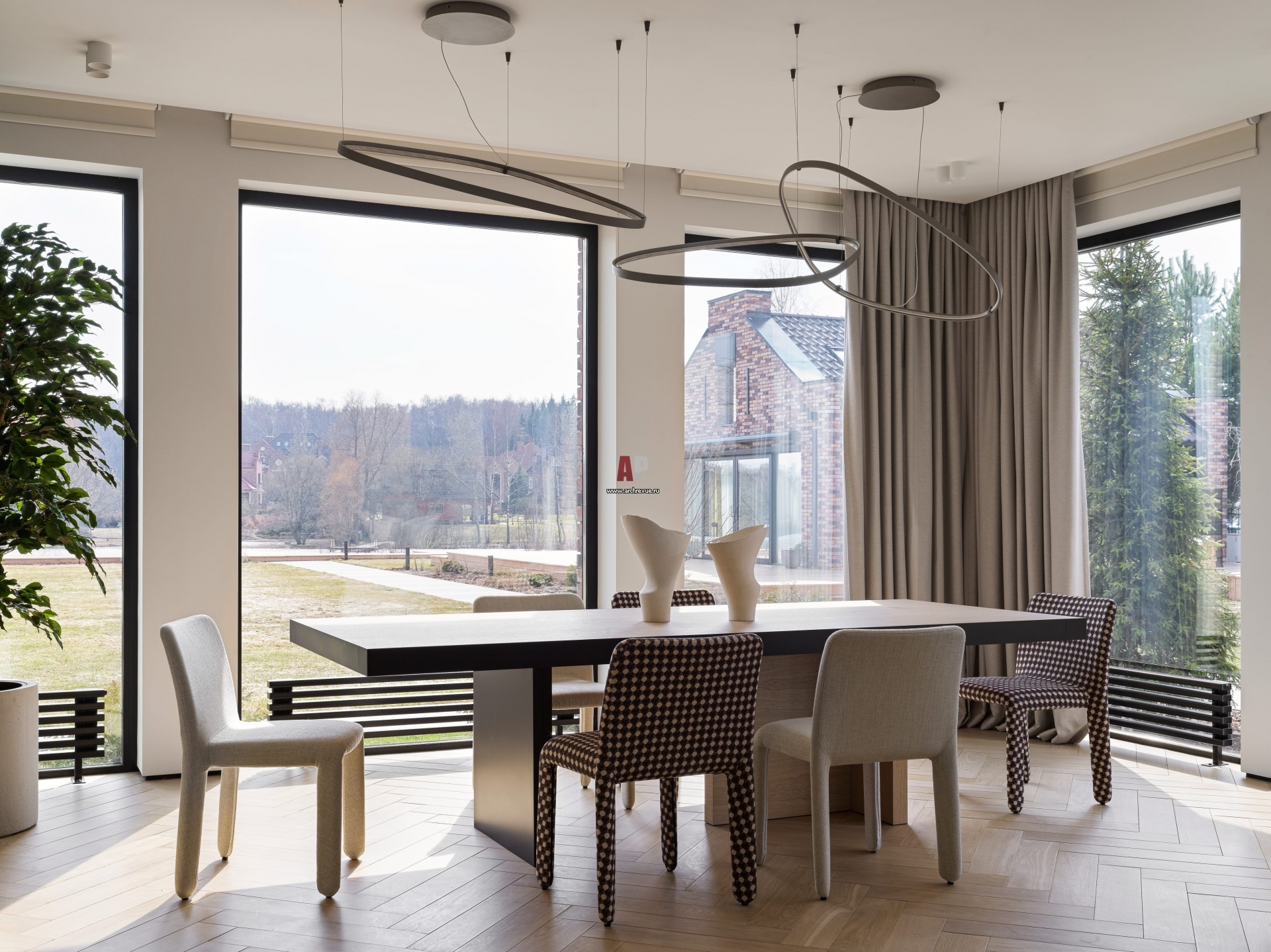 Столовая находится на месте присоединенной террасы и имеет панорамное остекление. Светильники, Cattelan Italia. Стол выполнен по эскизам дизайнеров. Стулья, Molteni &C. Вазы, Forest is calling.