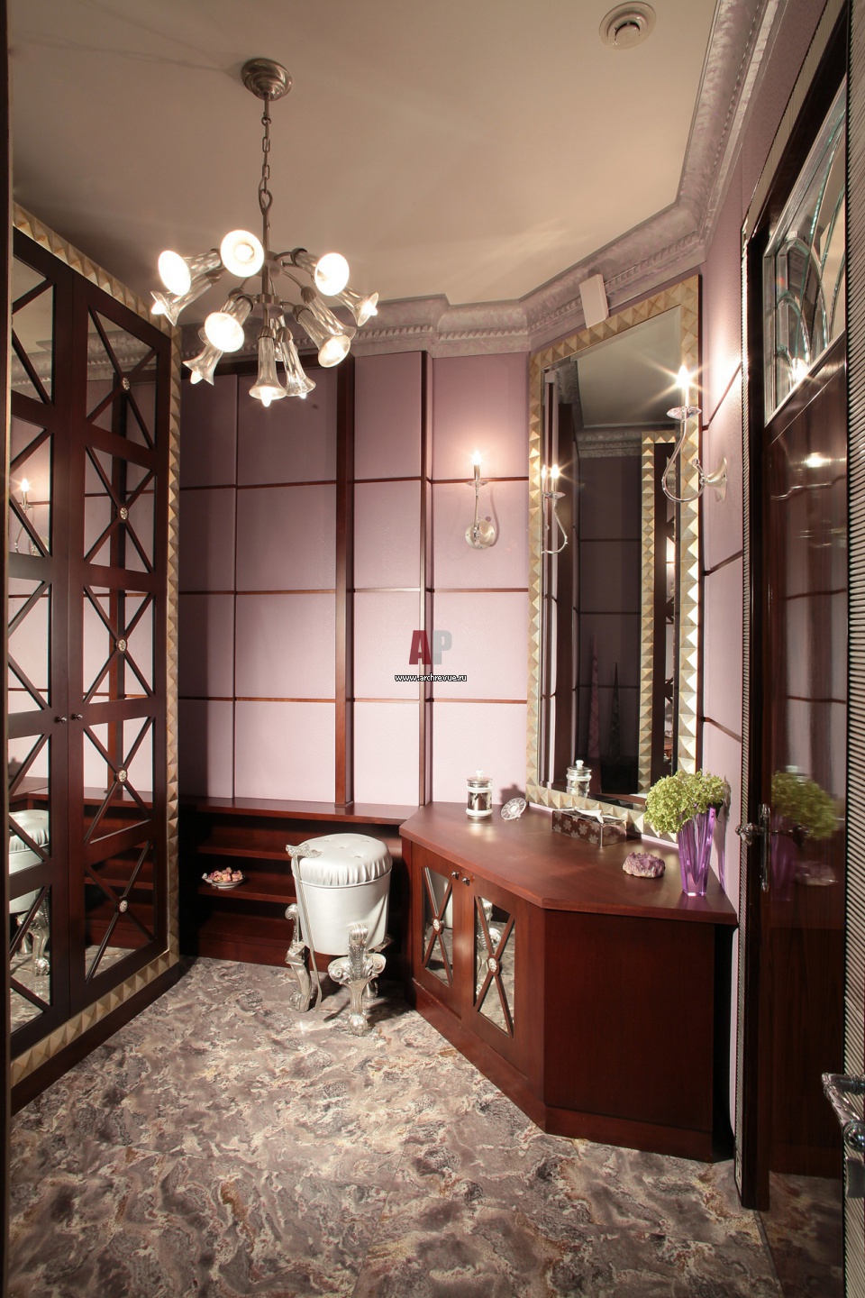 Встроенные шкафы в гардеробной выполнены по эскизам архитекторов на фабрике Boiserie Italia. Зеркальные панели украшены крестообразной деревянной раскладкой.
