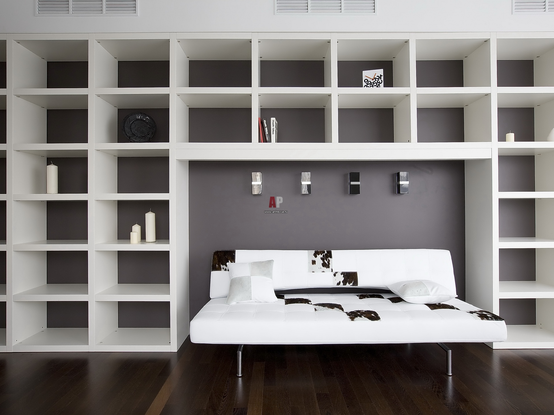 Библиотека выглядит необычайно стильно. Геометричный стеллаж, сделанный на заказ компанией «Страдивари», занимает всю стену. По центру размещен обтянутый белой кожей диван.