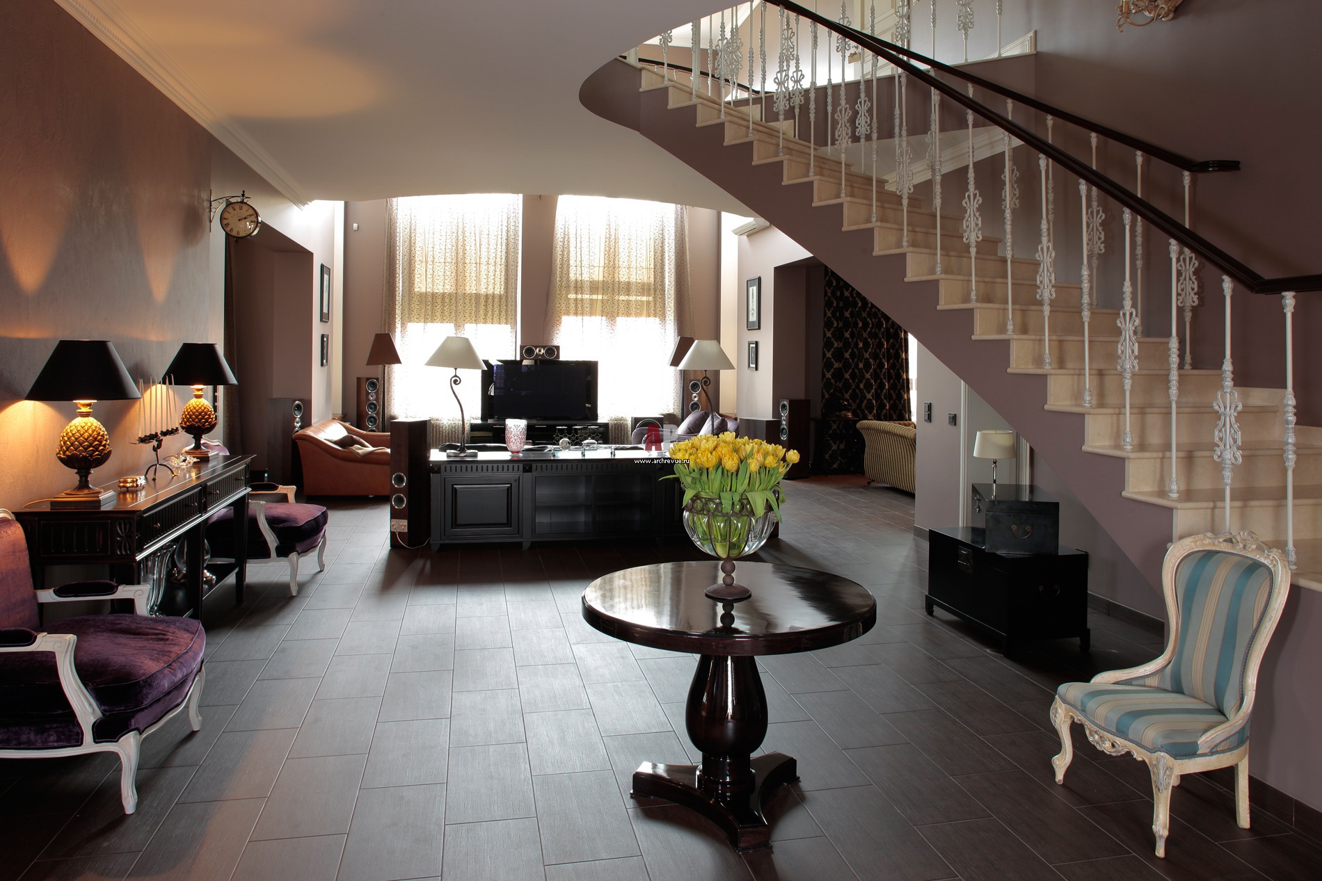 Фото интерьера лестничного холла загородного дома в стиле фьюжн