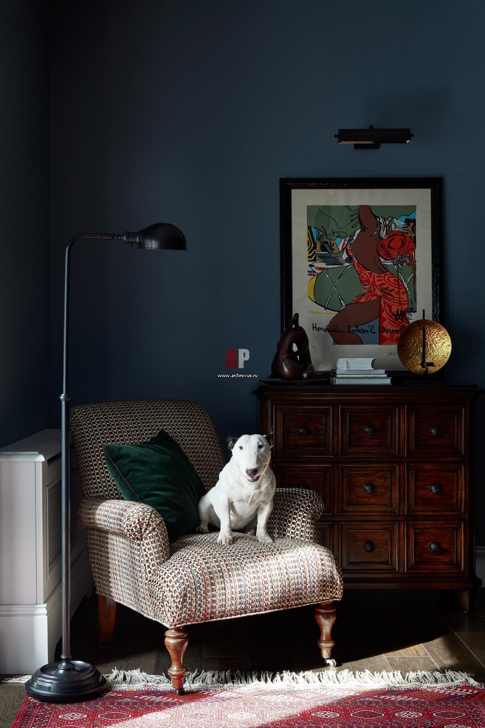 Интерьер кабинета-библиотеки выполнен в темной цветовой гамме. Комод из шпона ореха, Stanley Furniture. Кресло CR Laine обтянуто тканью Kravet Couture. Металлический торшер, Visual Comfort & Co.