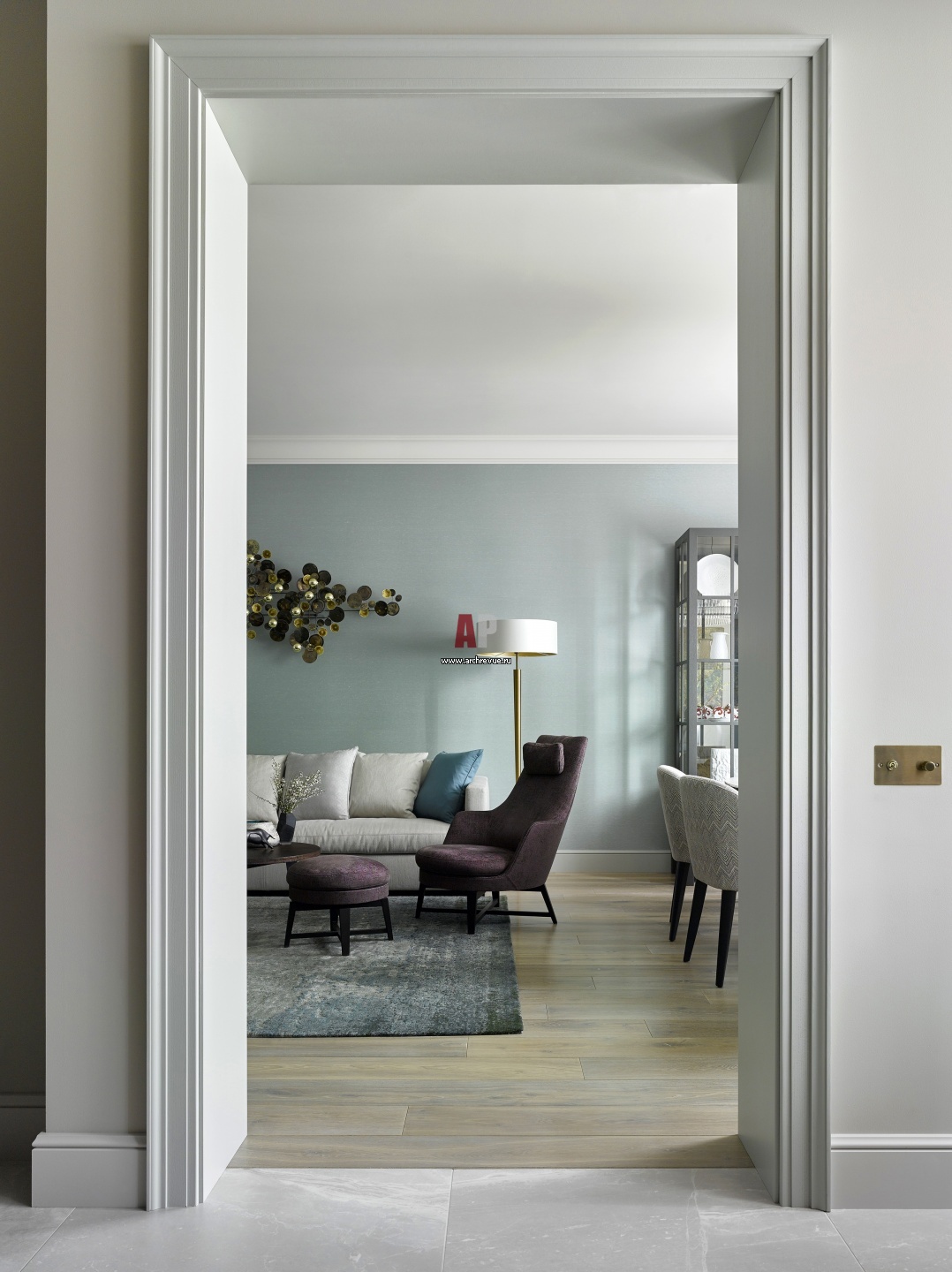 Семейная квартира в светлых жемчужно-голубых тонах. Интерьер гостиной.