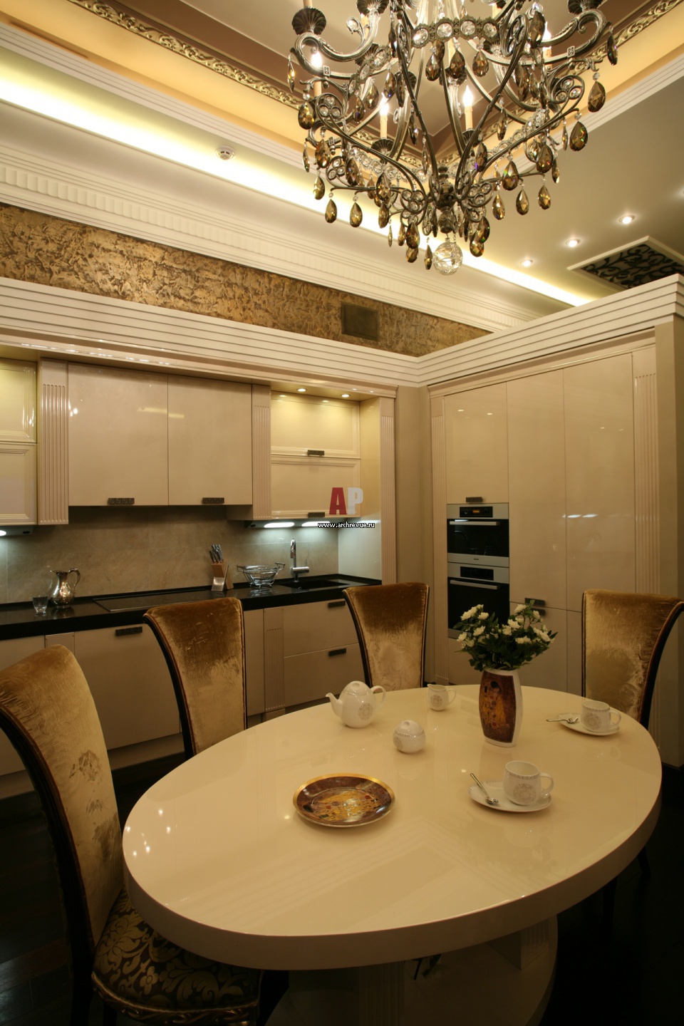 Кухня в неоклассике. Фасады кухонного гарнитура решены в лаке. Верхние полки декорированы широким карнизом.