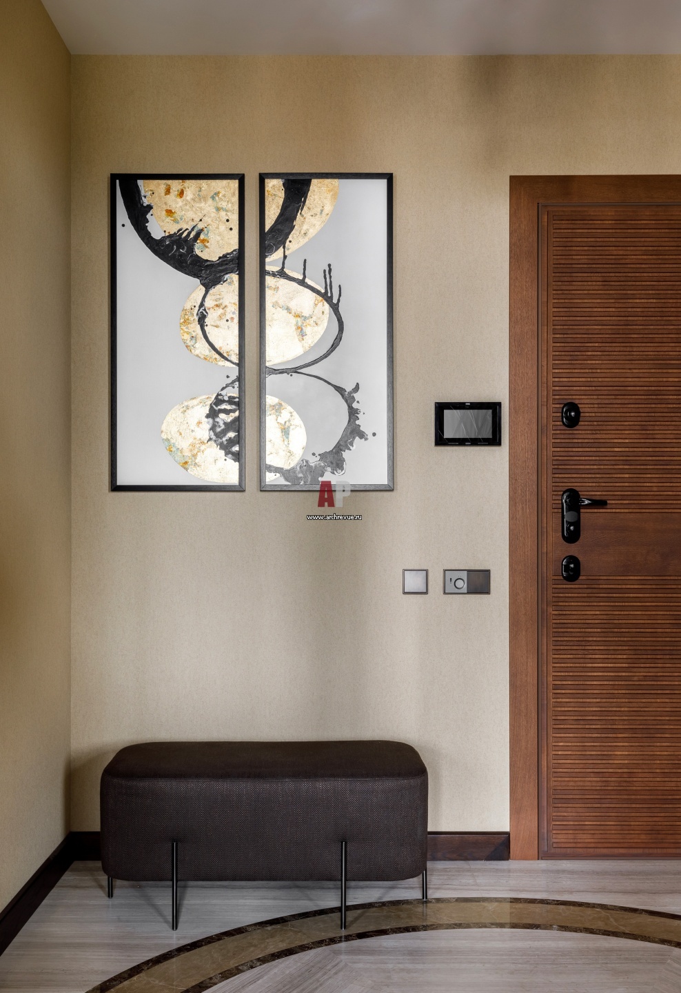 Интерьер прихожей в теплых тонах. На стене – тканые обои, Arte. На полу – панно из мрамора с круговым орнаментом. Дверь с горизонтальной раскладкой, Dorian.