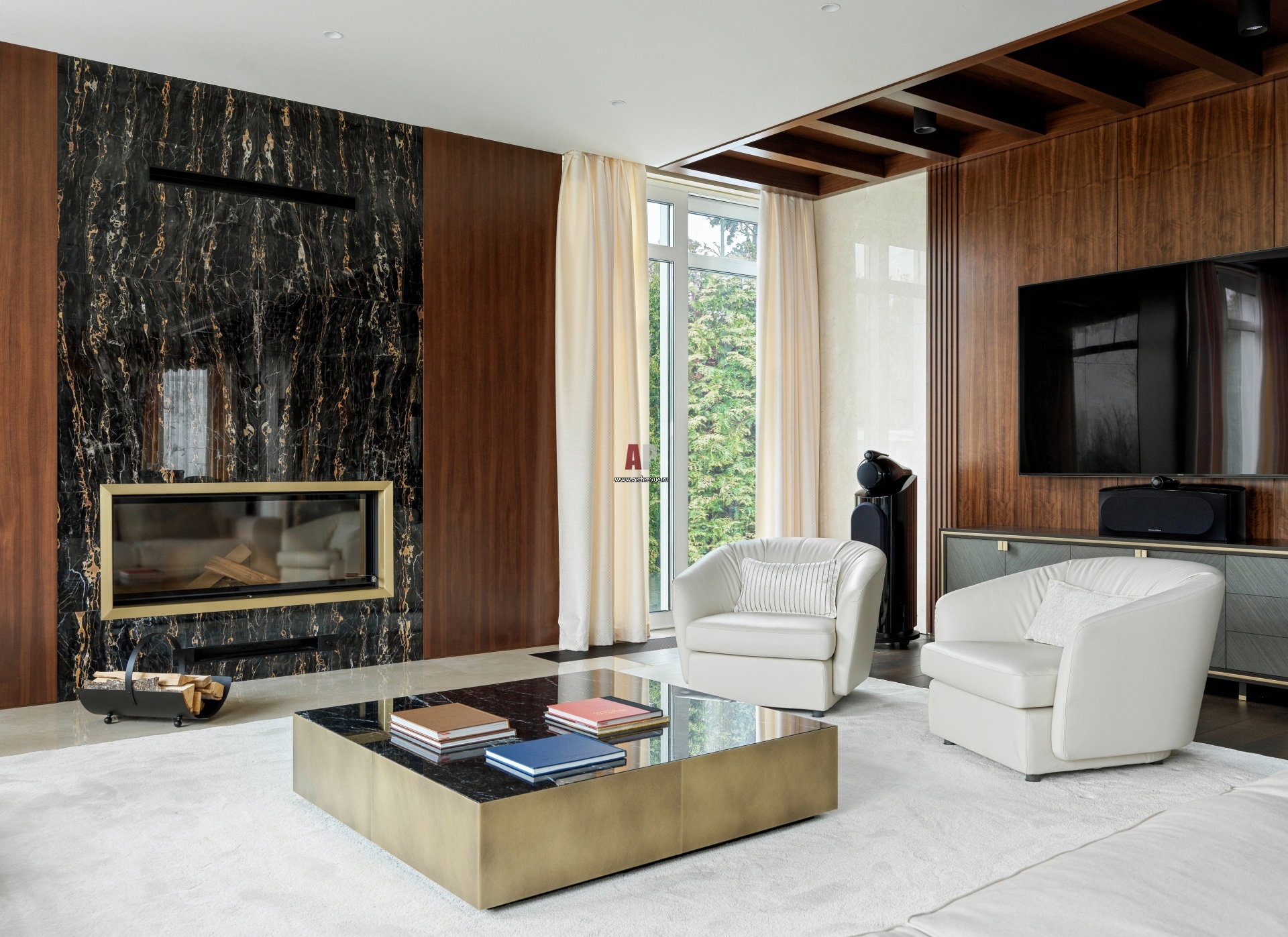 Каминная группа в гостиной. Камин закрытого типа оформлен слэбом гранита с пестрым рисунком. Стеновые и потолочные панели из шпона ореха сделаны на заказ на российском производстве.