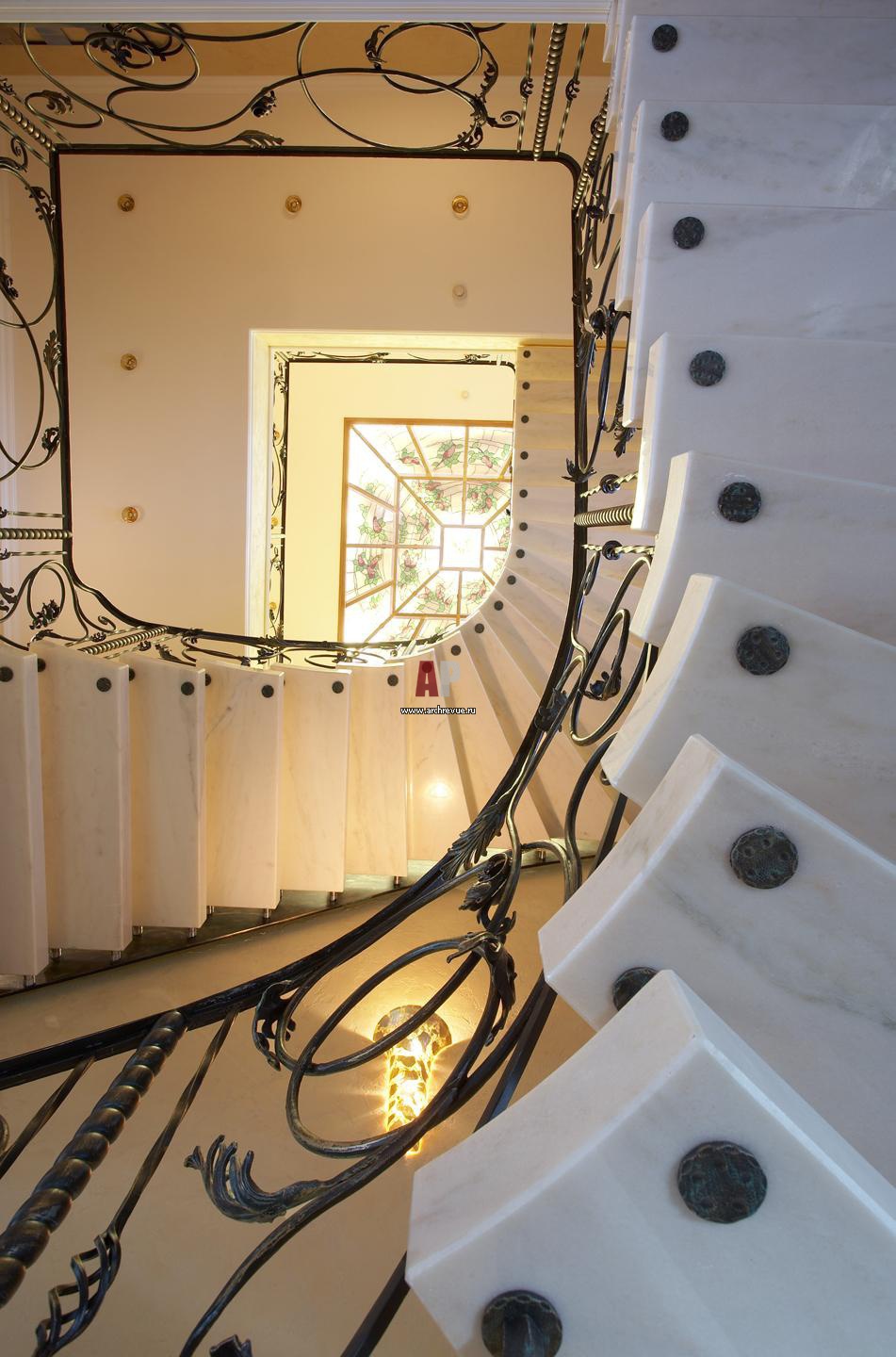 Лестница – одна из главных осей в пространстве этого дома. Невесомая, прозрачная, оплетенная тончайшим кованым ограждением, она связала все интерьерные решения этого дома. Лестница выполнена по авторскому проекту, поставщик «СМквадрат». Ковка, компания «Эквитес».