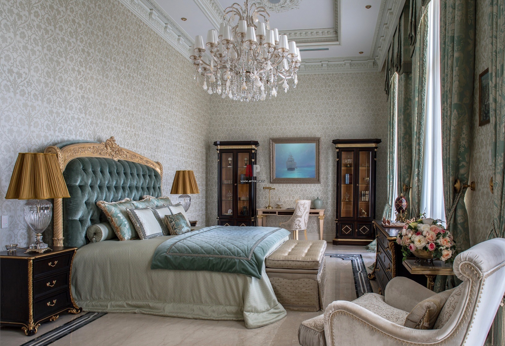 Интерьер классической спальни с оттенками зеленой яшмы. В доме порядка 200 окон: чтобы каждому найти достойное обрамление, архитекторы использовали большое количество классических моделей с ламбрекенами, джаботами, свагами. Портьеры сшиты из тканей лучших европейских производителей, которые используют в производстве старинные технологии.