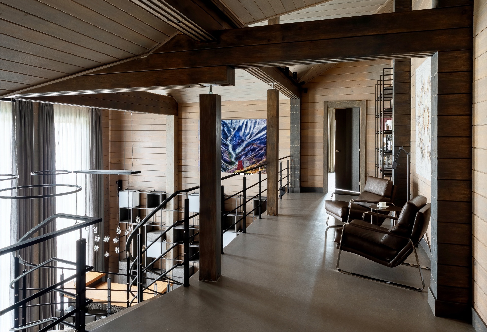 Холл второго этажа. Кожаные кресла, Linteloo, модель Kone. Металлический стеллаж изготовлен в Голландии по индивидуальным чертежам.