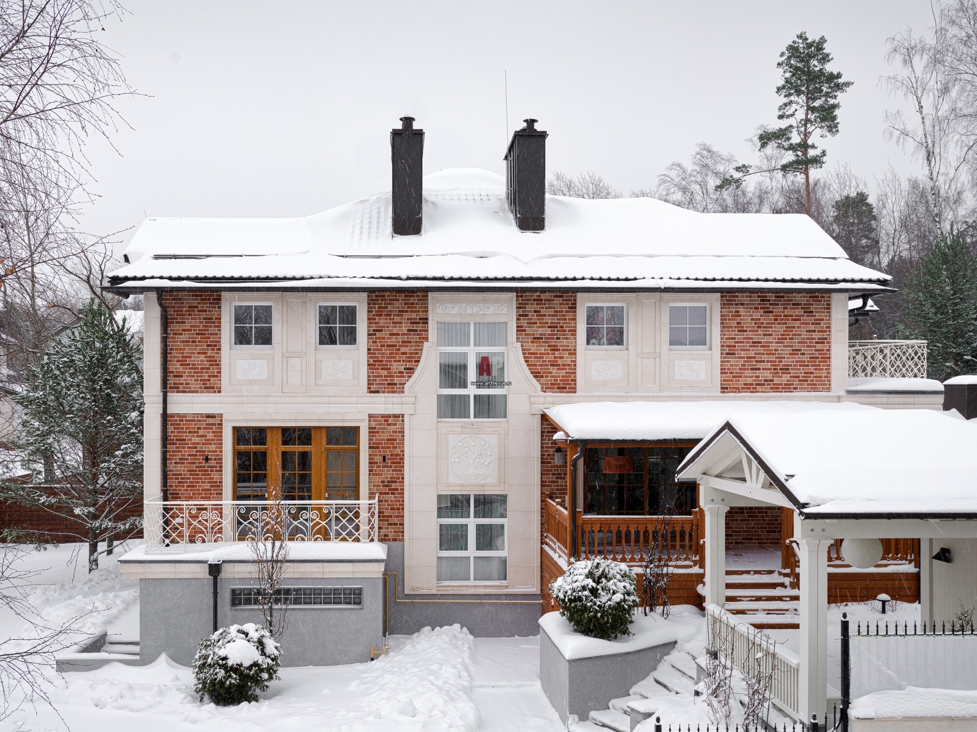 Фасады дома оформлены клинкерным кирпичом и светлым архитектурным камнем. Чтобы поверхность выглядела более живой и как бы акварельной, было использовано несколько разных оттенков клинкера, King Klinker. Фасад, выходящий в сад, украшен несколькими рельефами в виде медальонов работы художников-скульпторов Лолы Метелкиной и Игоря Кабишева. К кухне примыкает деревянная терраса.