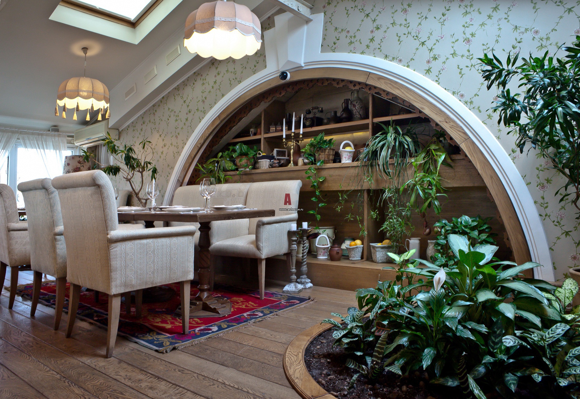Интерьер зала ресторана. В полукруглой арке устроен стеллаж для домашней утвари.