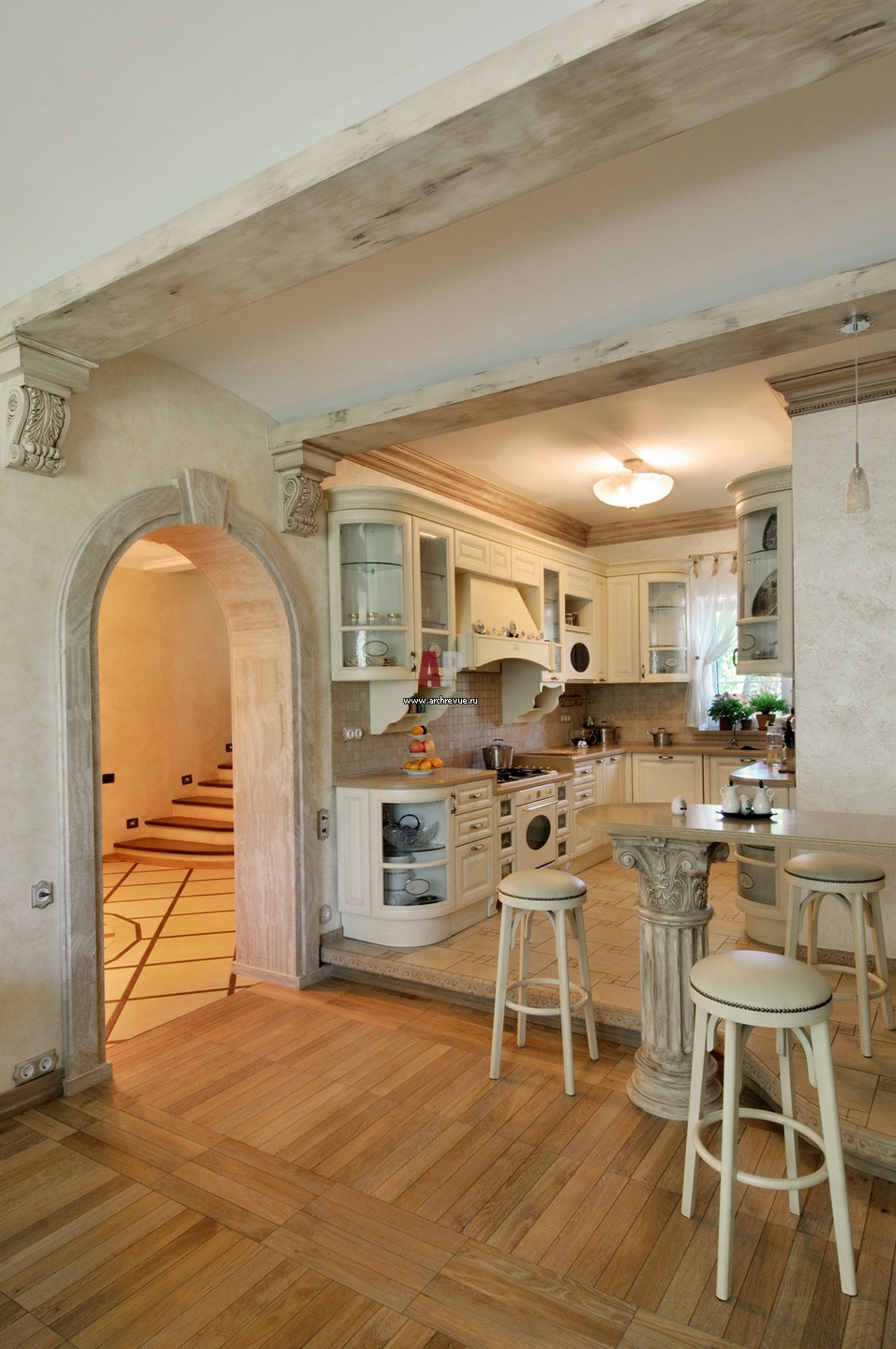 Интерьер кухни в стиле кантри отличают декоративные финиши на стенах, поставщик «Финкраска». Итальянская кухня Aster Cucine, поставщик «Галерея на Трифоновской», выполнена под старину в цвете слоновой кости