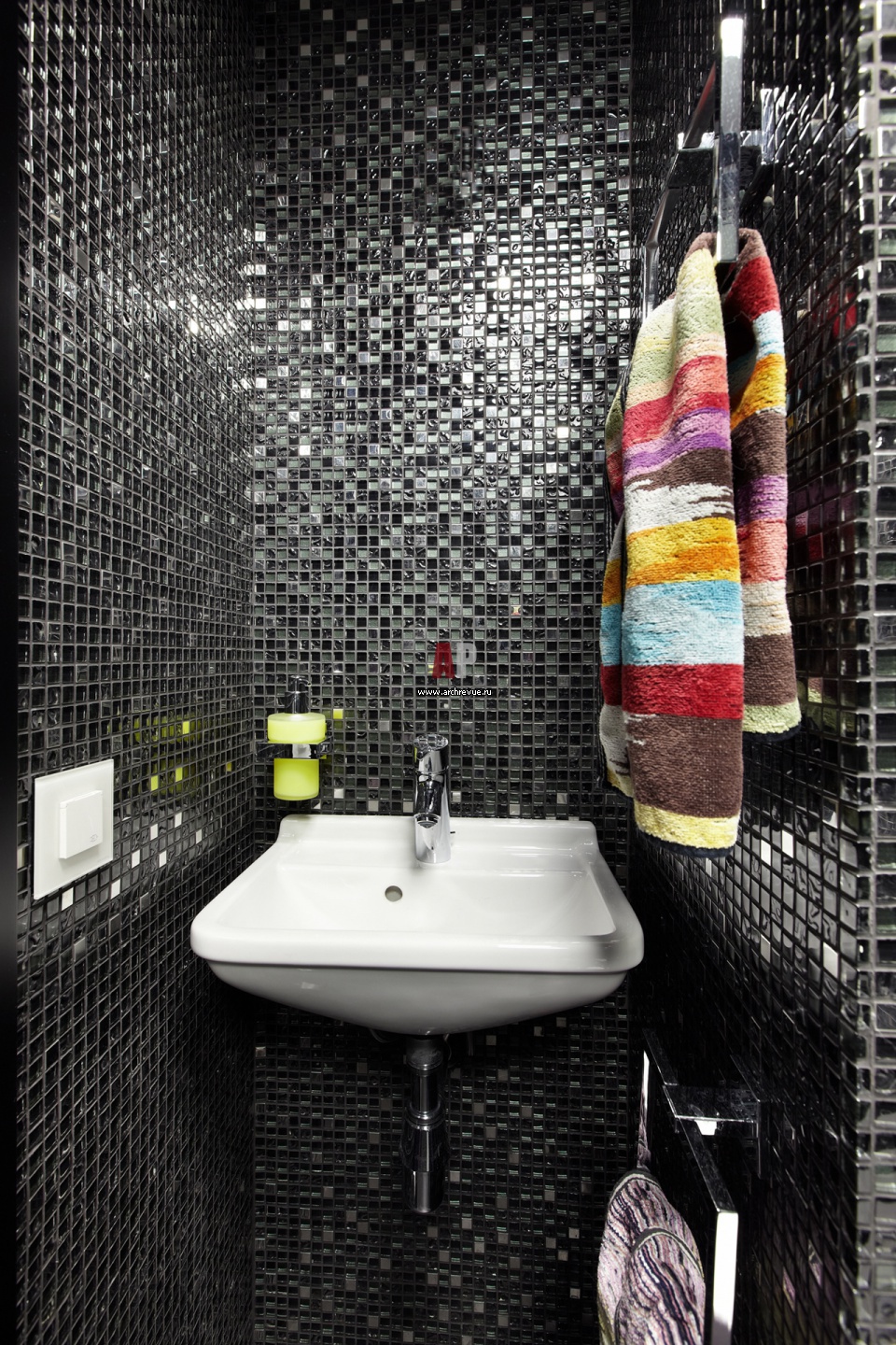Интерьер небольшого туалета, стены облицованы черной плиткой под мозаику.