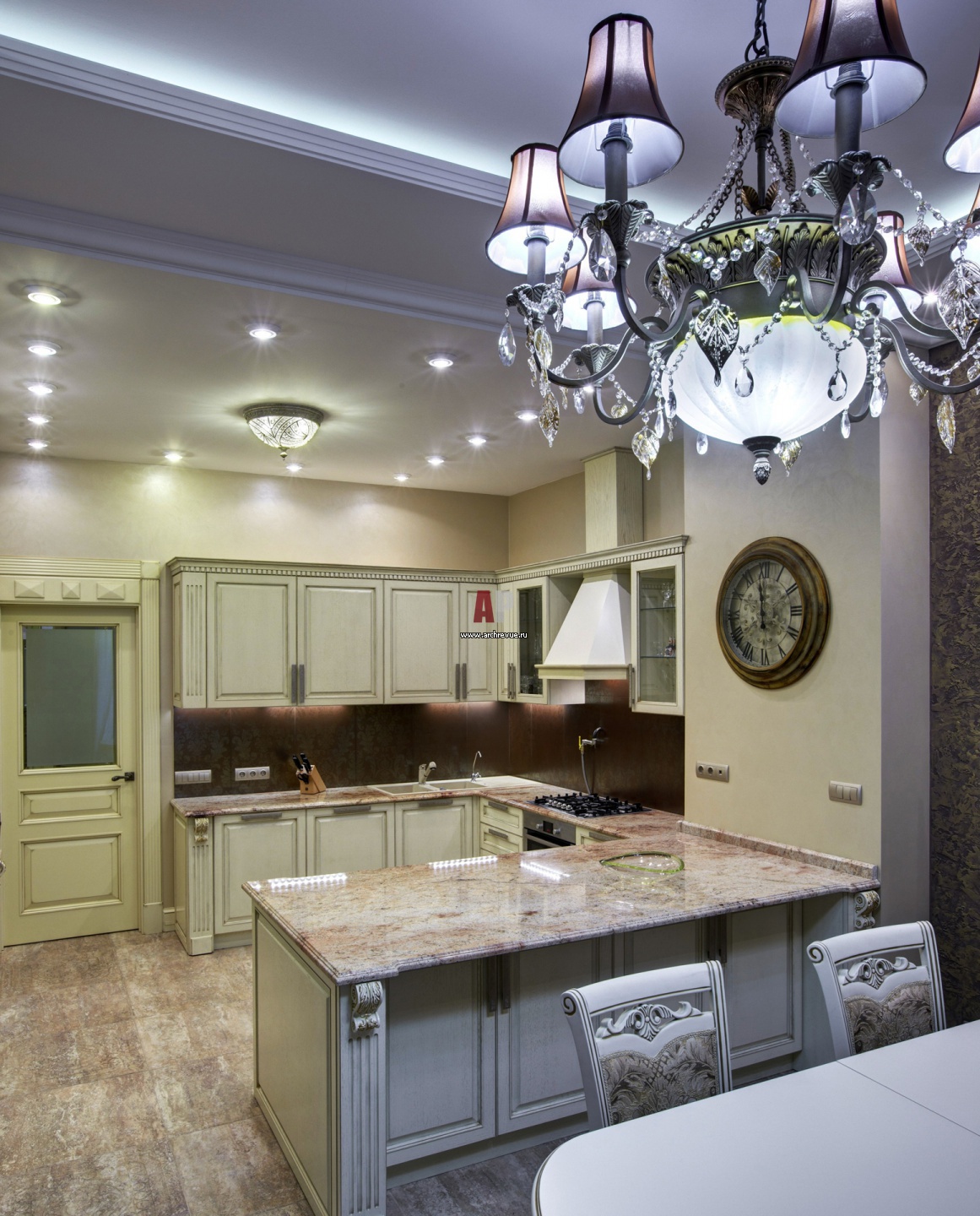 Неоклассический интерьер кухни выполнен в светло-фисташковом цвете. На кухне предусмотрен лифт-подъемник для доставки блюд.