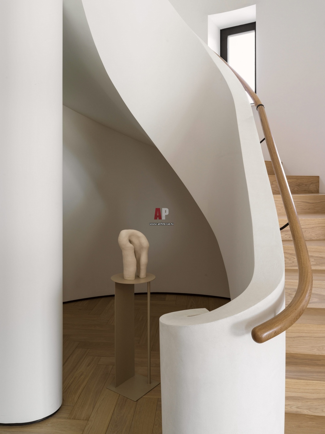Дом выходного дня с элементами минимализма и природным дизайном. Лестница отлита из бетона, округлые гнутые перила изготовлены из дерева. Пьедестал, Ferm Living. На нем скульптура Натальи Коншиной.