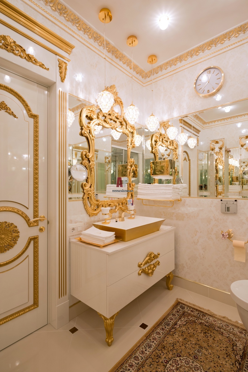 Интерьер ванной комнаты в классическом стиле выполнен в белой цветовой гамме с золотыми деталями.
